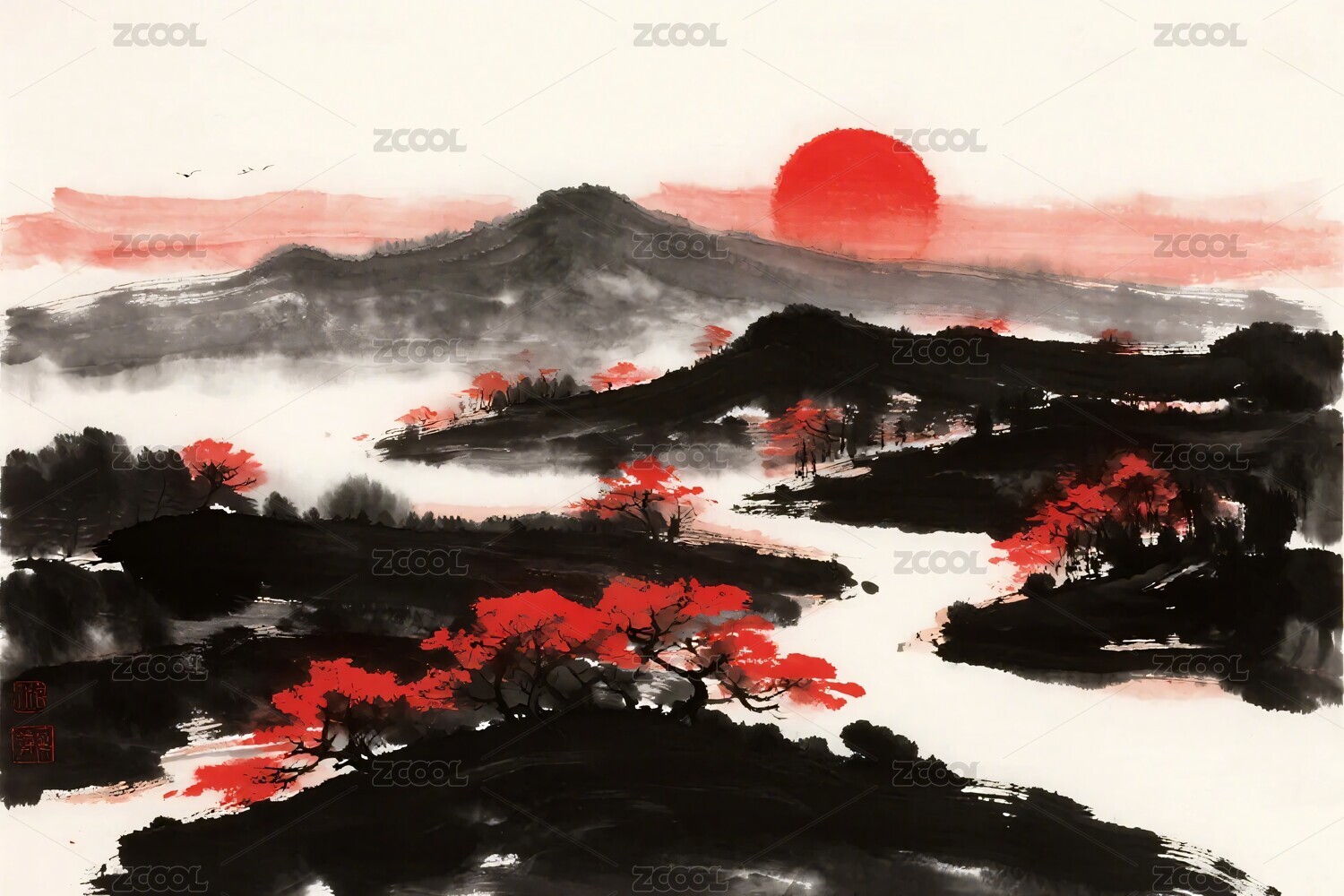 水墨山水红日飞鸟图景