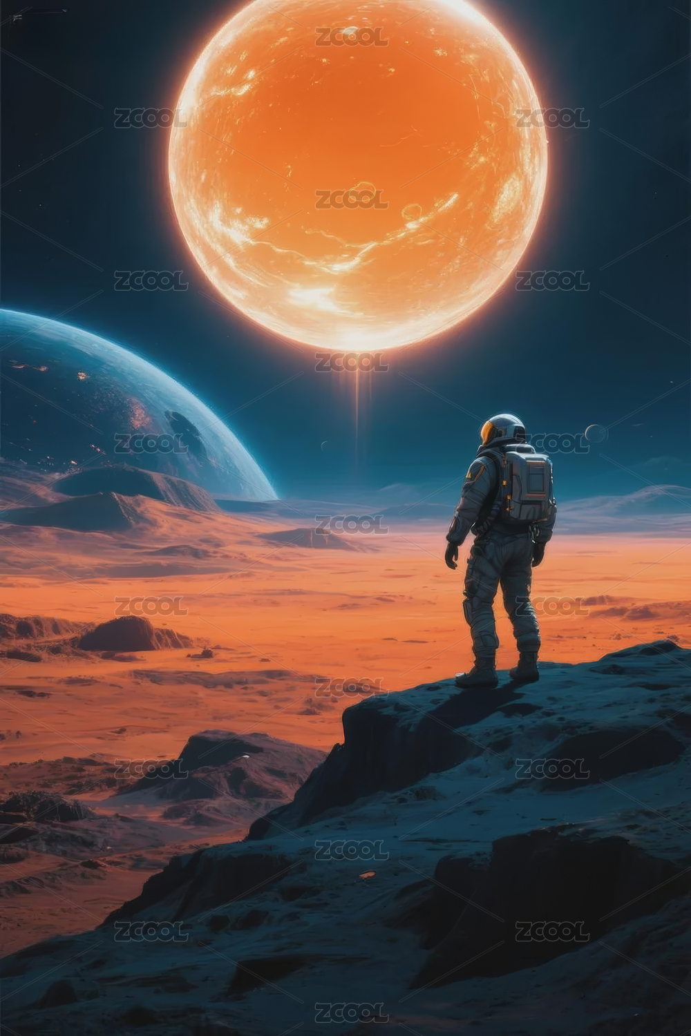 宇航员坐着看向星球远方的背影