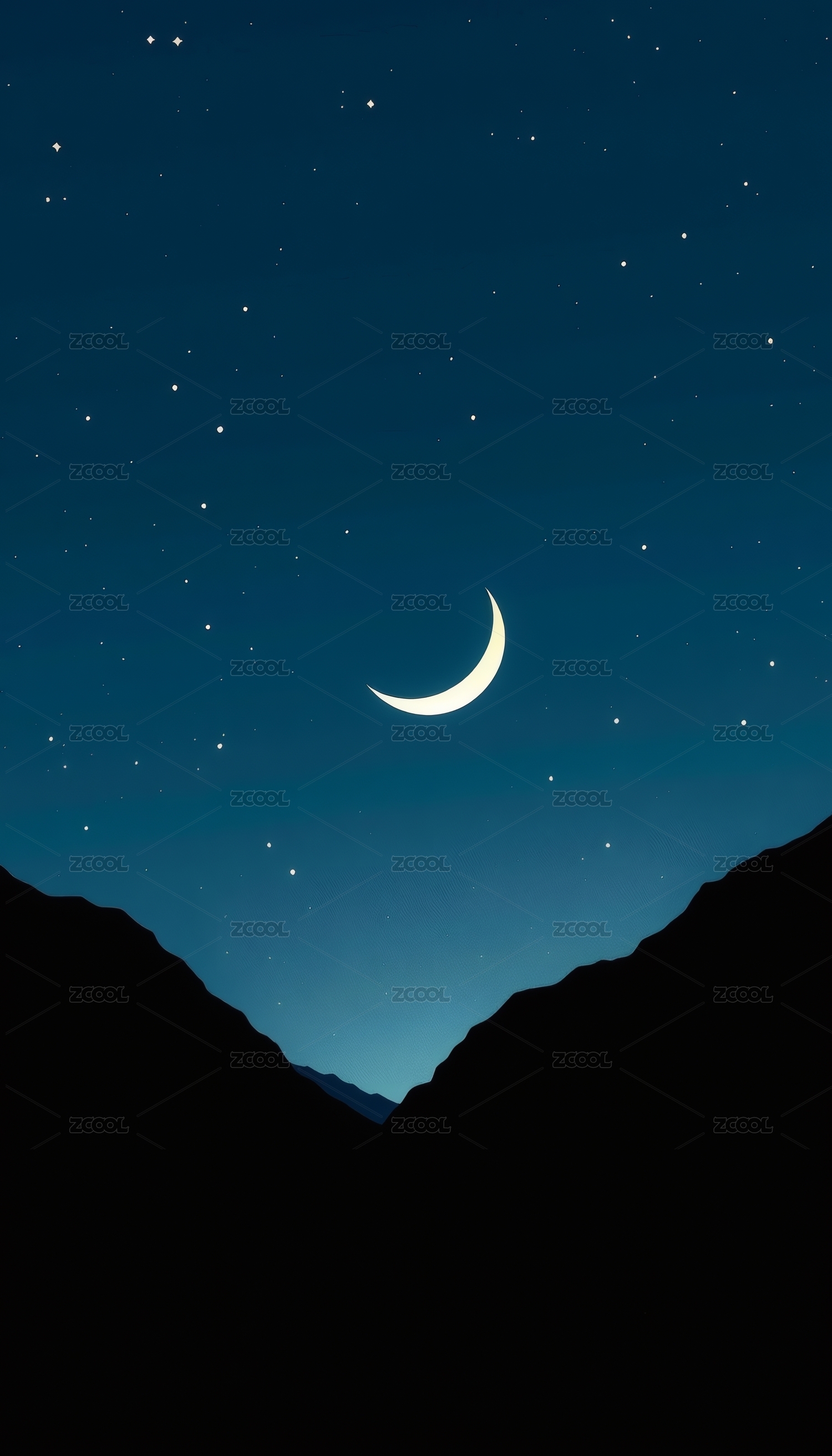 夜空下的新月与山峦和繁星