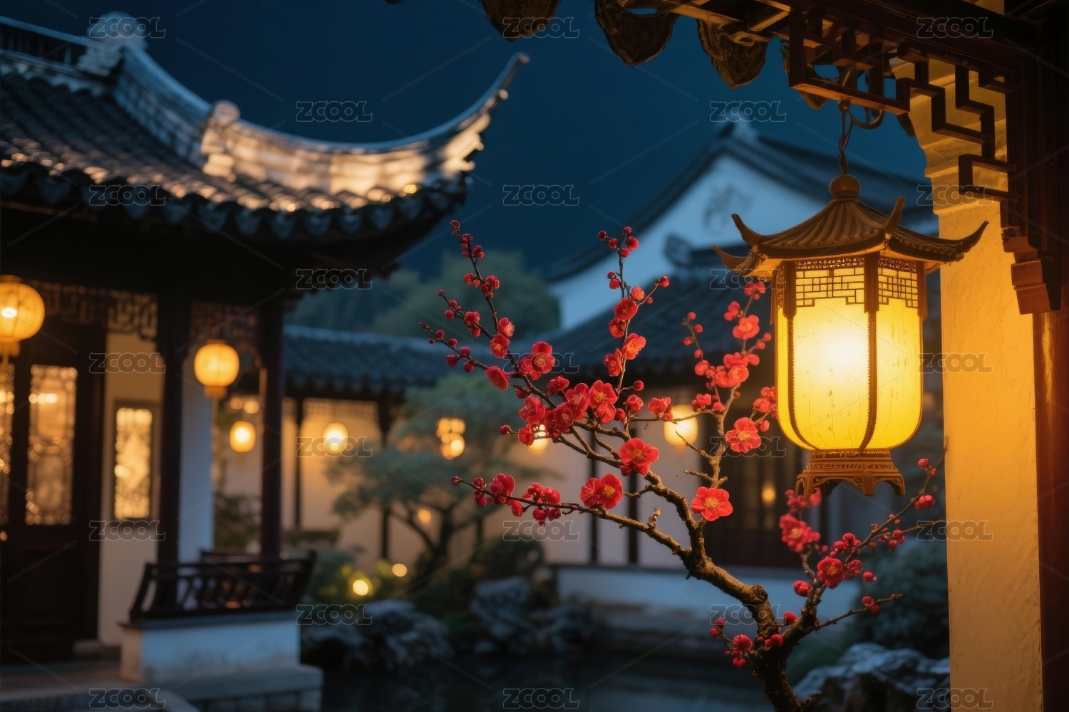 窗户, 艺术,江南, 园林, 白墙, 灰瓦, 梅花, 红花, 树枝, 庭院