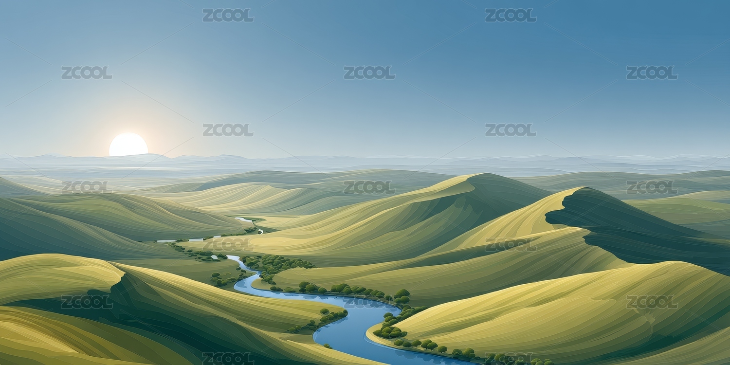 宁静起伏山丘与蜿蜒河流景观