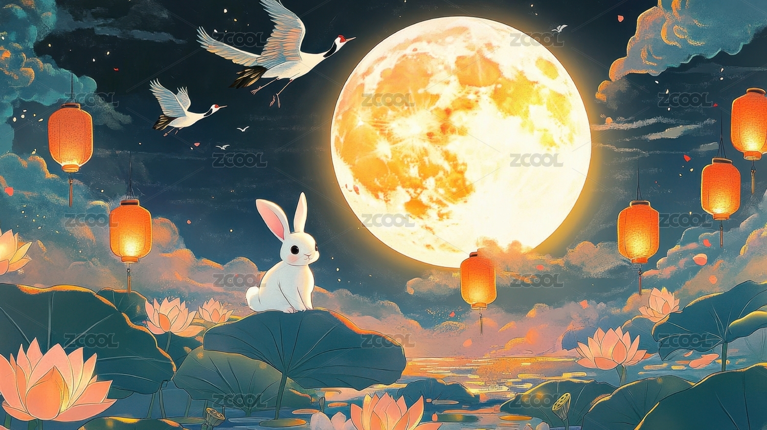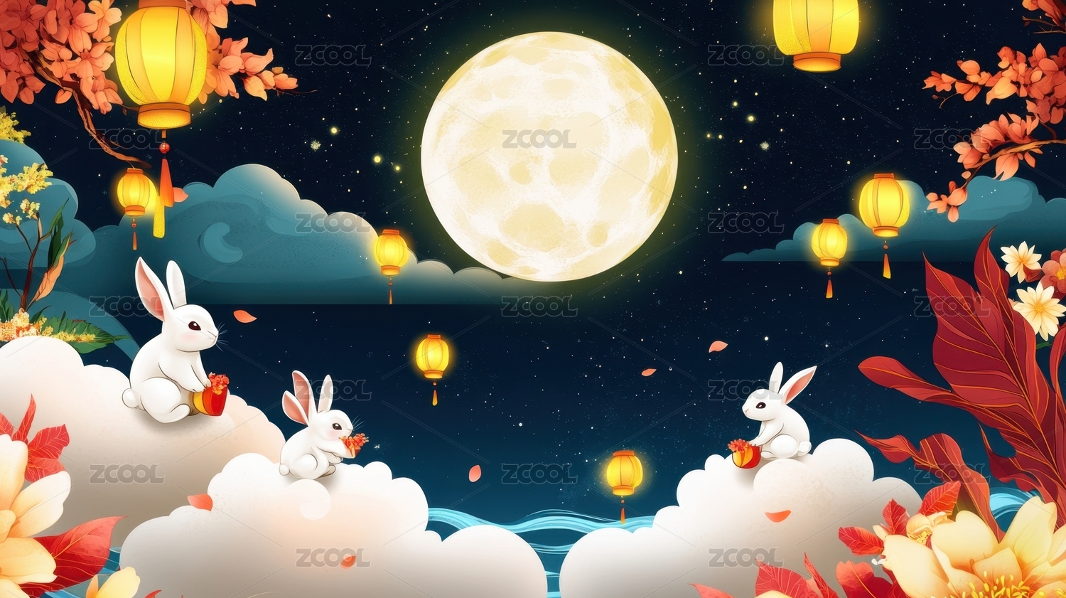 夜空的满月,白兔坐在屋顶吃月饼,中秋节