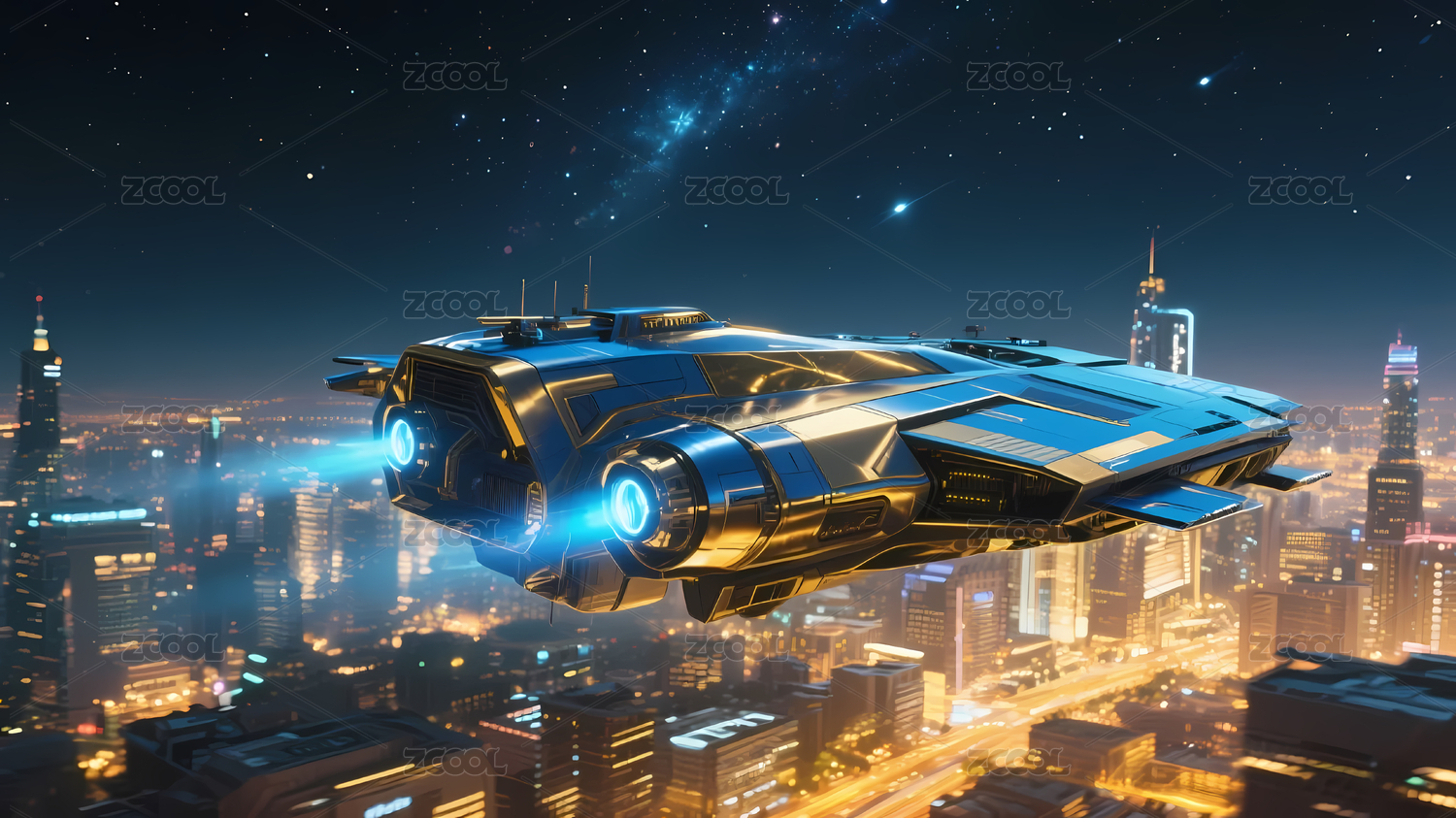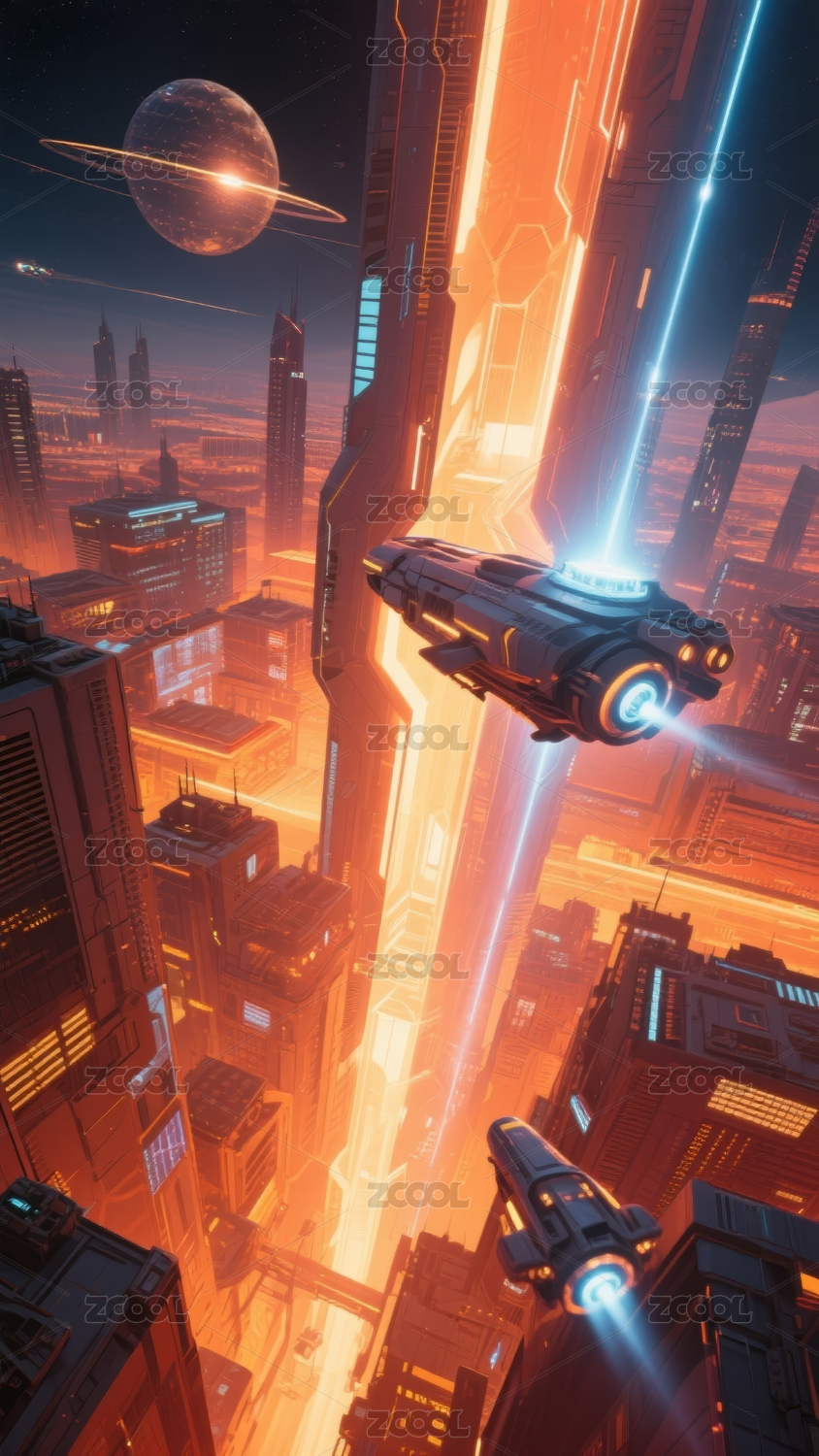 未来城市空中高楼间飞行的汽车3D科幻插画