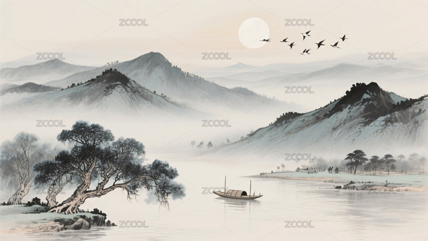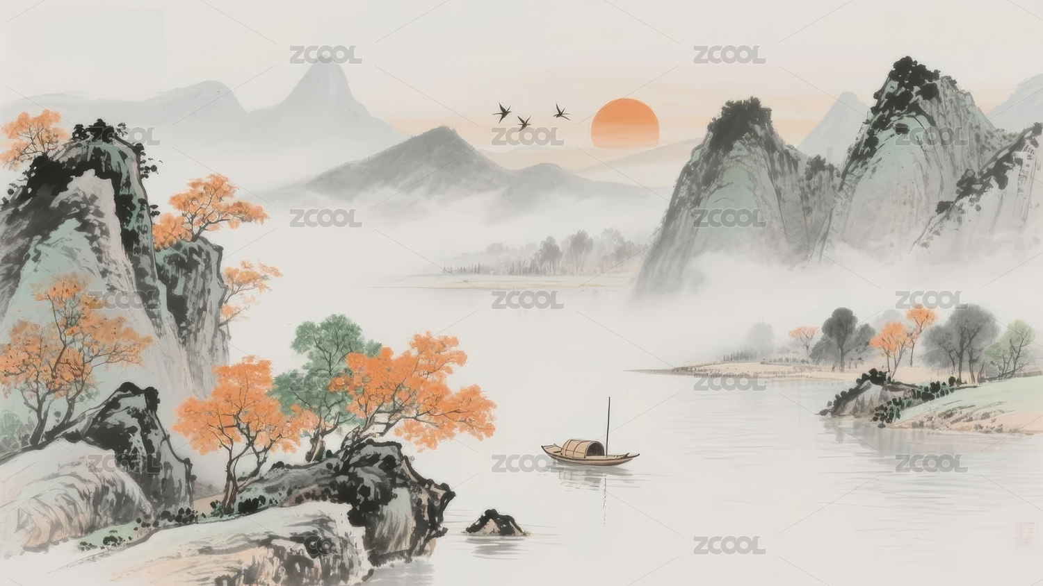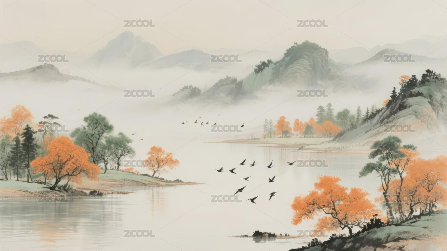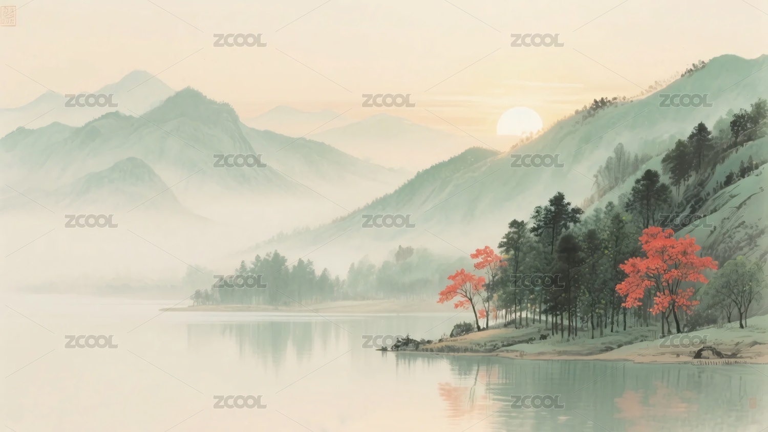 艺术, 传统, 美丽, 自然, 宁静, 风景, 绿色, 橙色, 树木, 远山