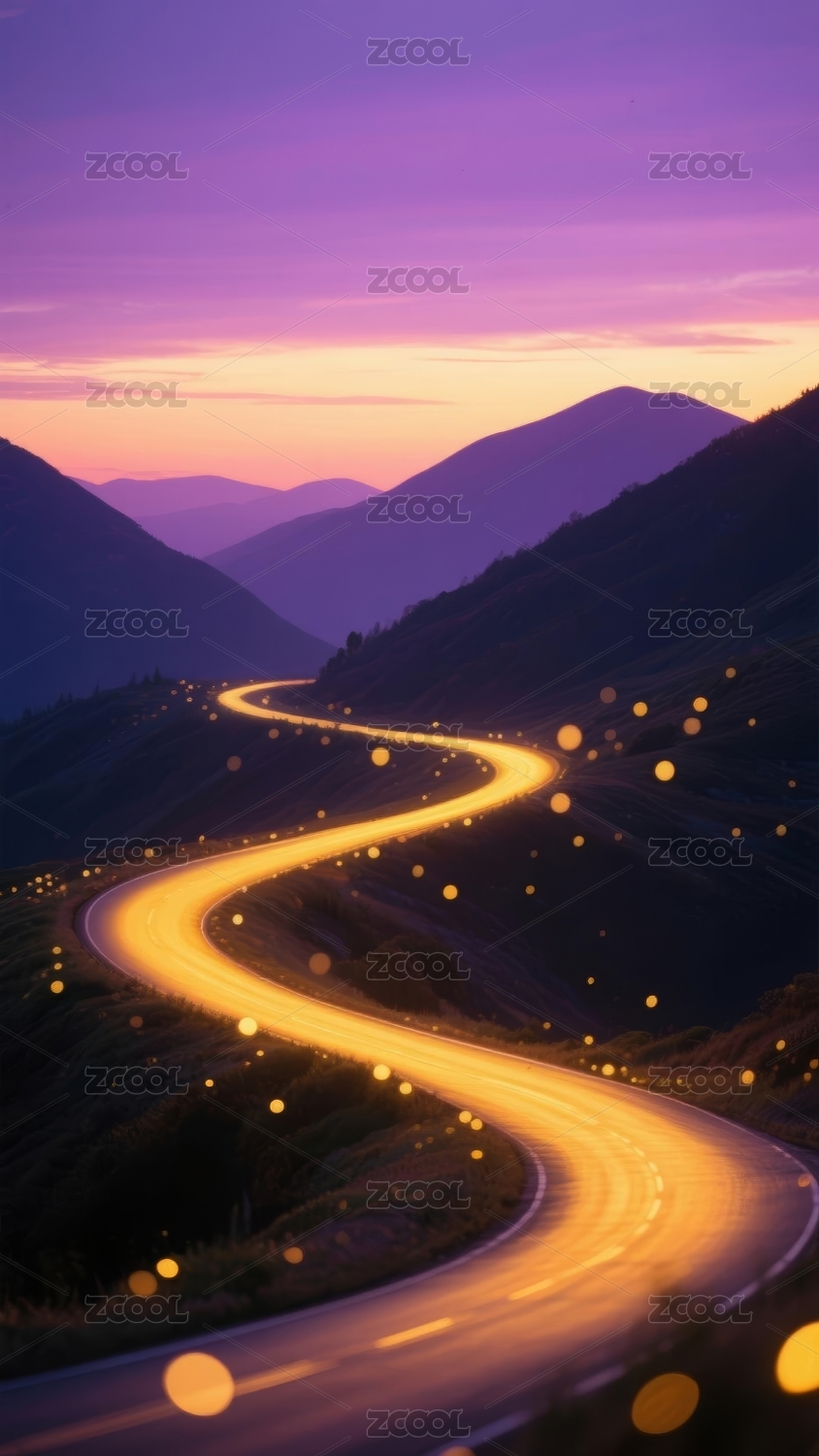 风景, 自然, 美丽, 宁静,夜晚, 山脉, 公路, 灯光, 曲线, 紫色