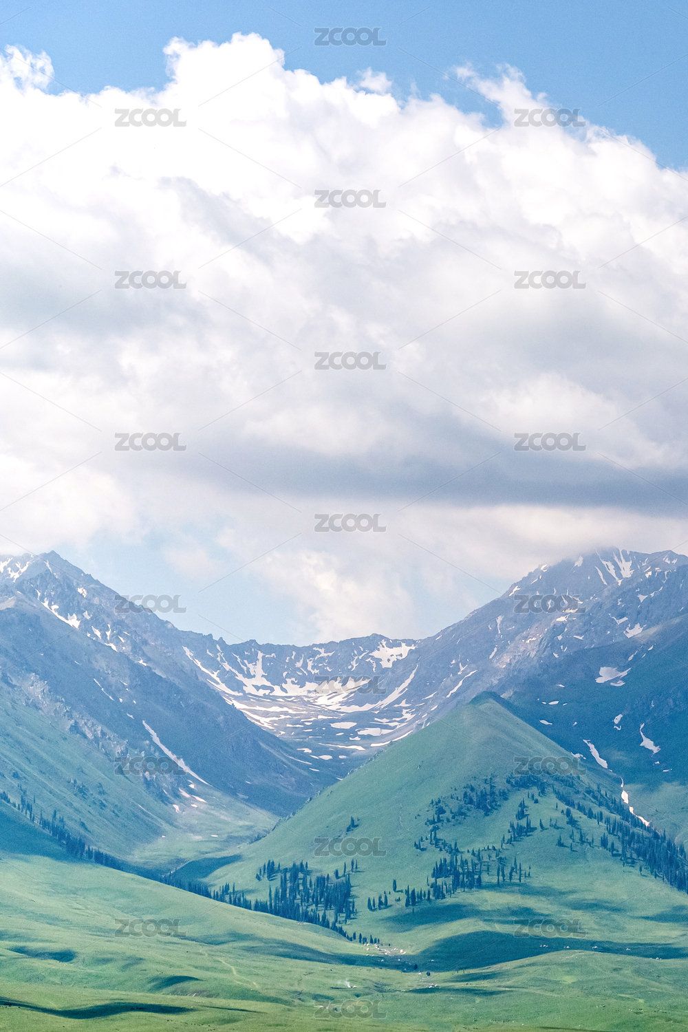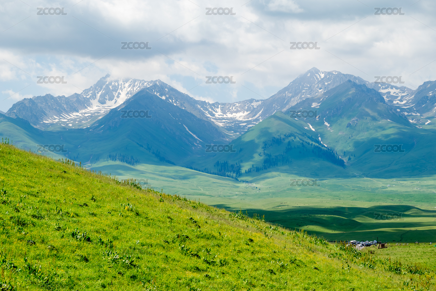六月,中国新疆恰西草原上瞭望远处的雪山