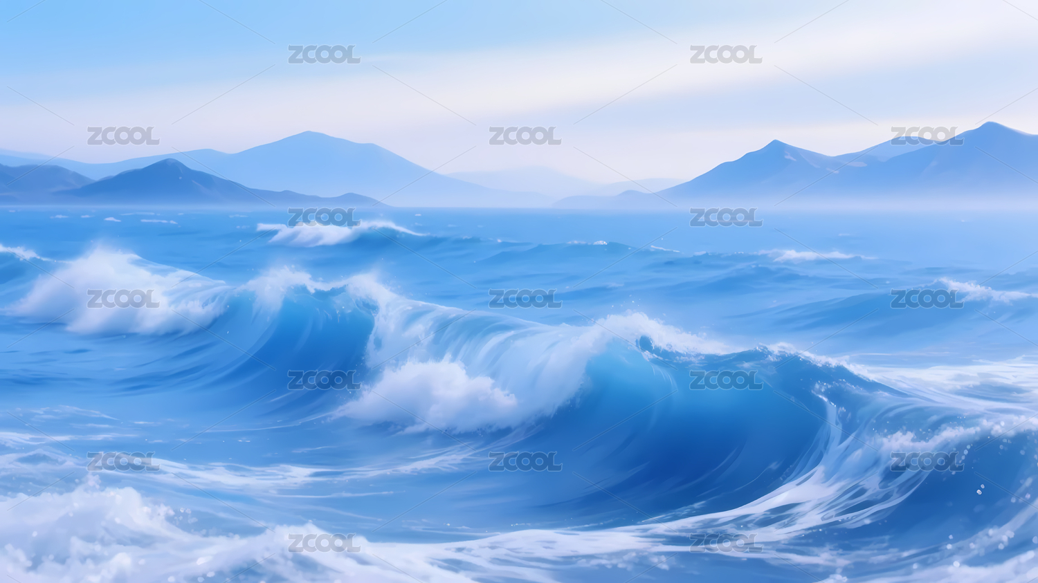 蓝天白云下一道壮观的海浪浪尖处水花飞溅