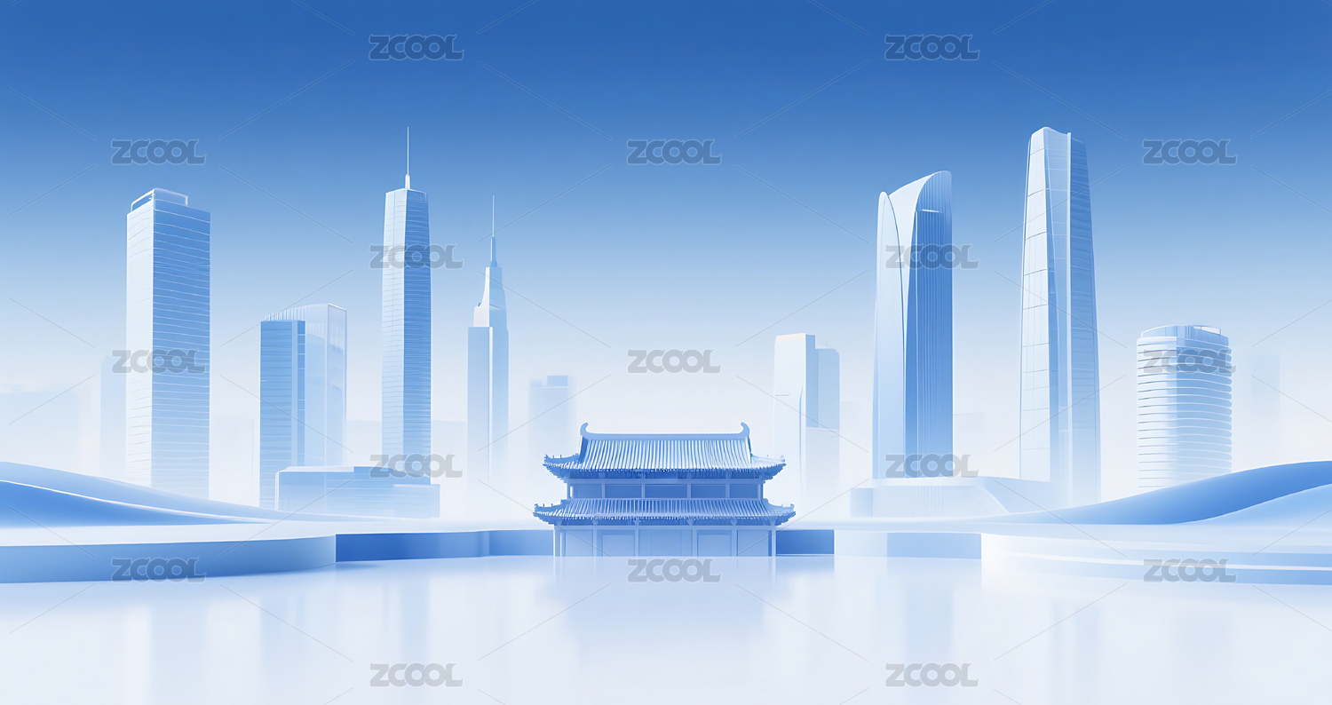 蓝色现代城市建筑和古建筑插画背景壁纸