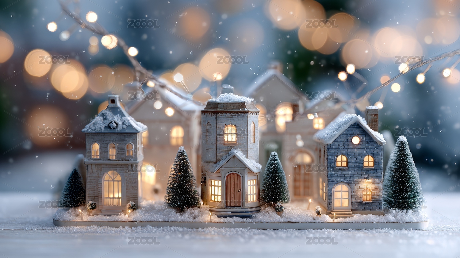 冬日雪景迷你房屋与暖灯