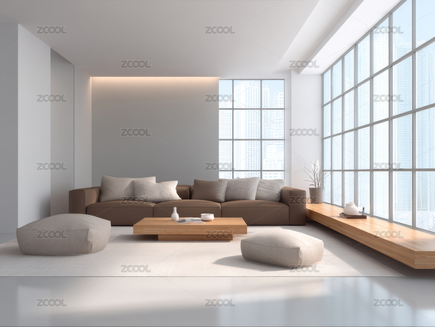 落地窗建筑内部大理石展厅带办公桌沙发窗外