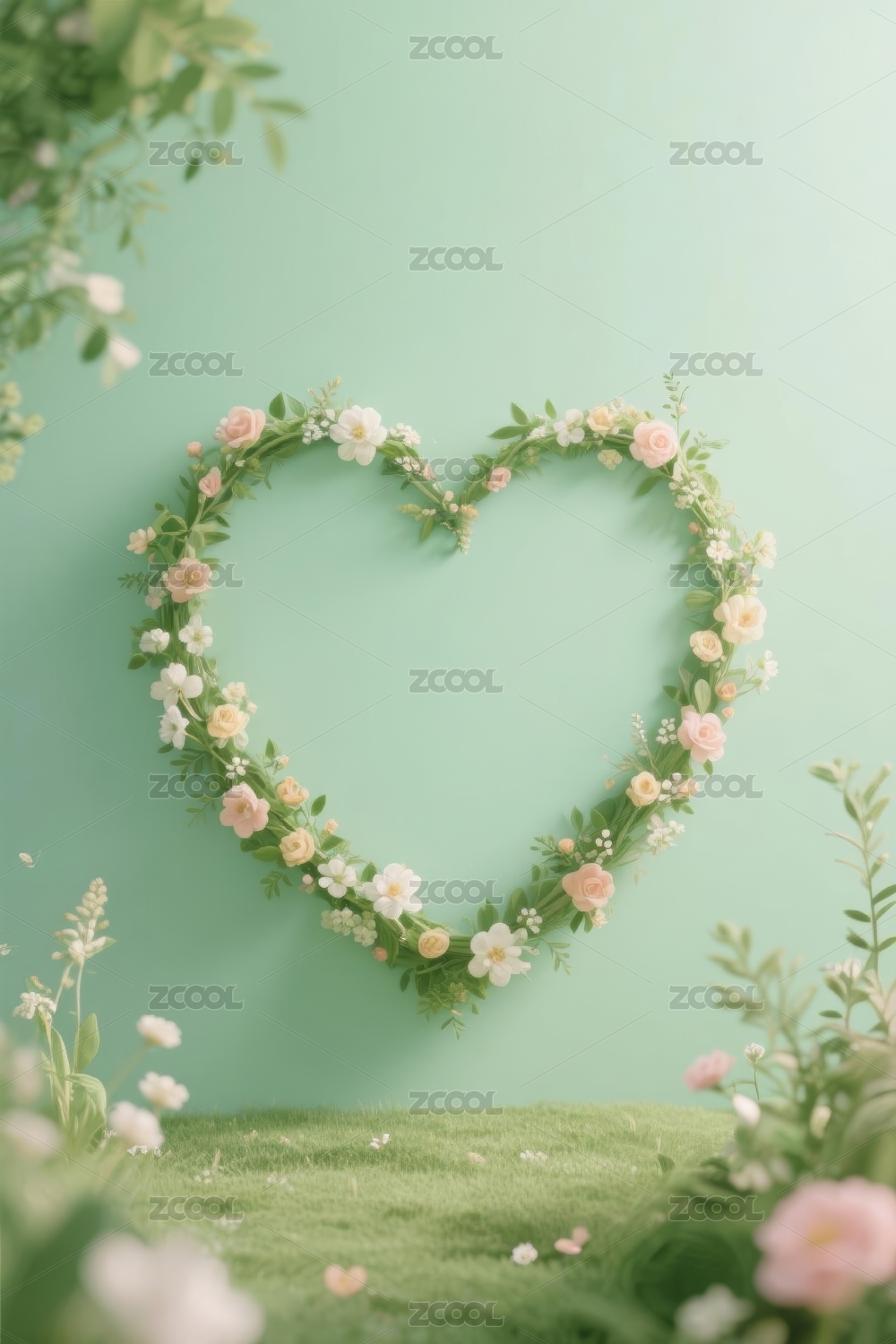 花卉心形设计配以柔和色彩和绿色植物