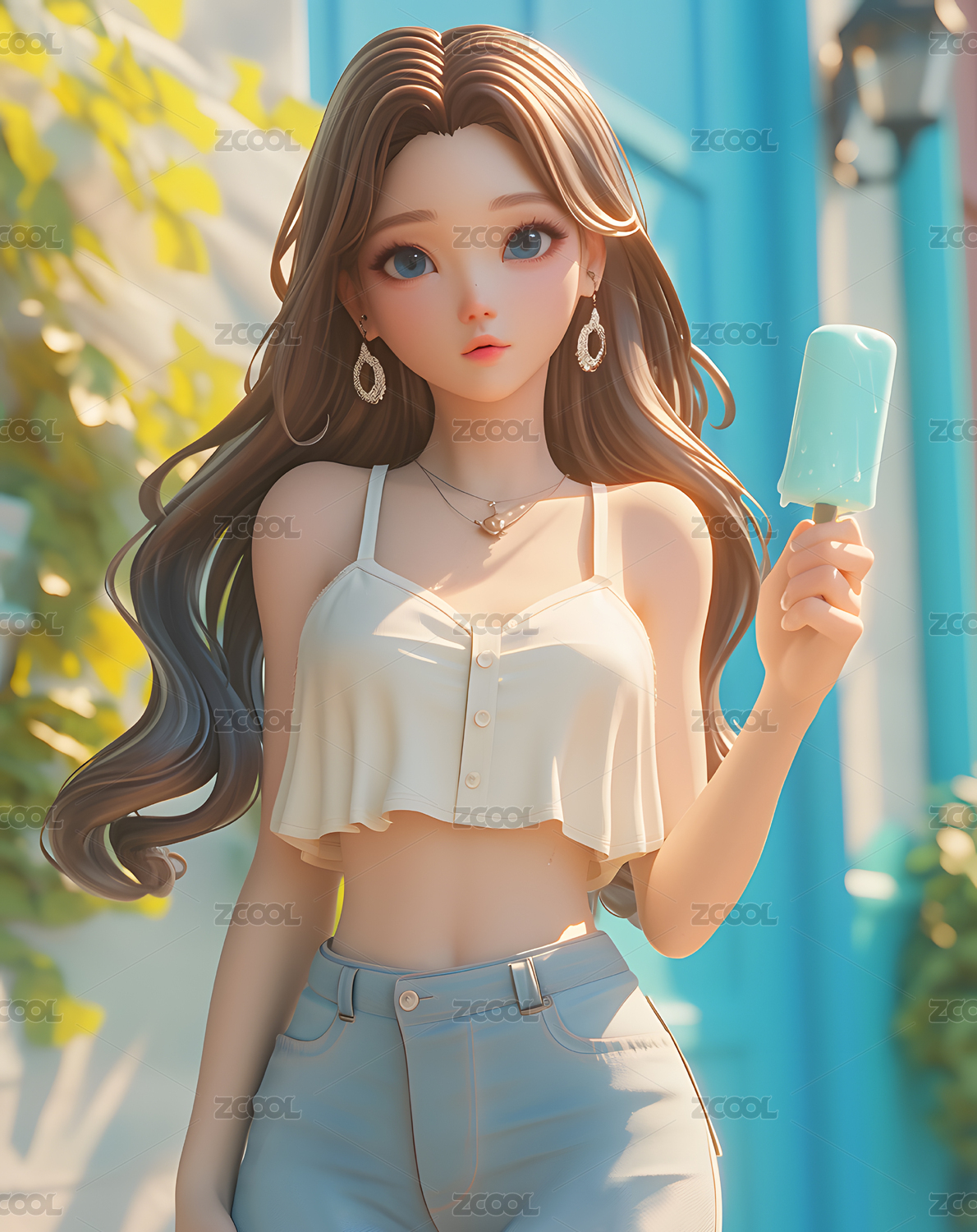 夏日多巴胺鲜艳高饱配色吃冰淇淋的女孩插画