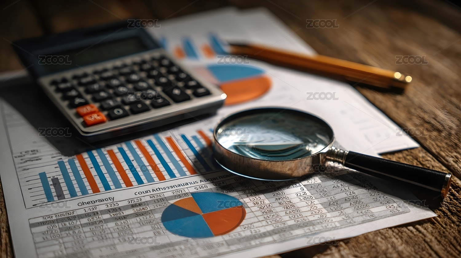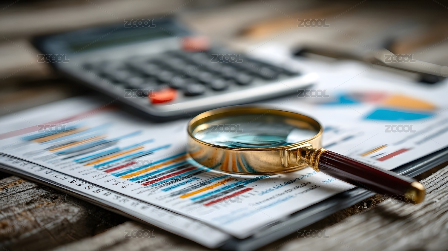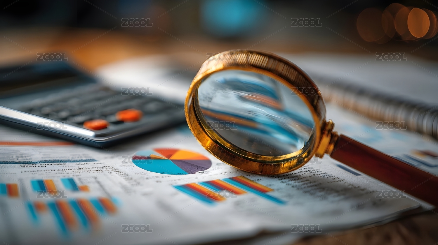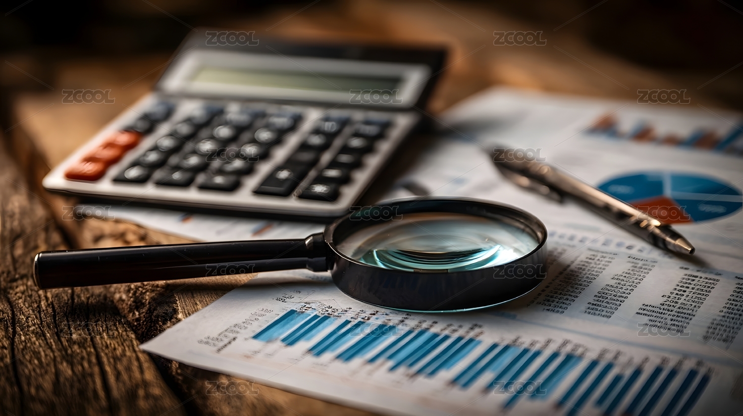 图表,放大镜,计算器,数据,纸张,蓝色,桌面,分析,工具,报告