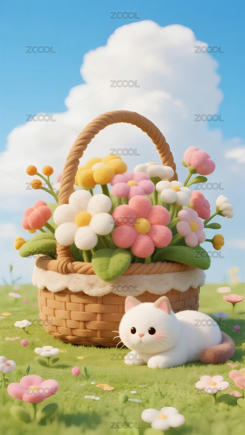 白天晴天绿色原野尖耳朵猫3D立体卡通插画