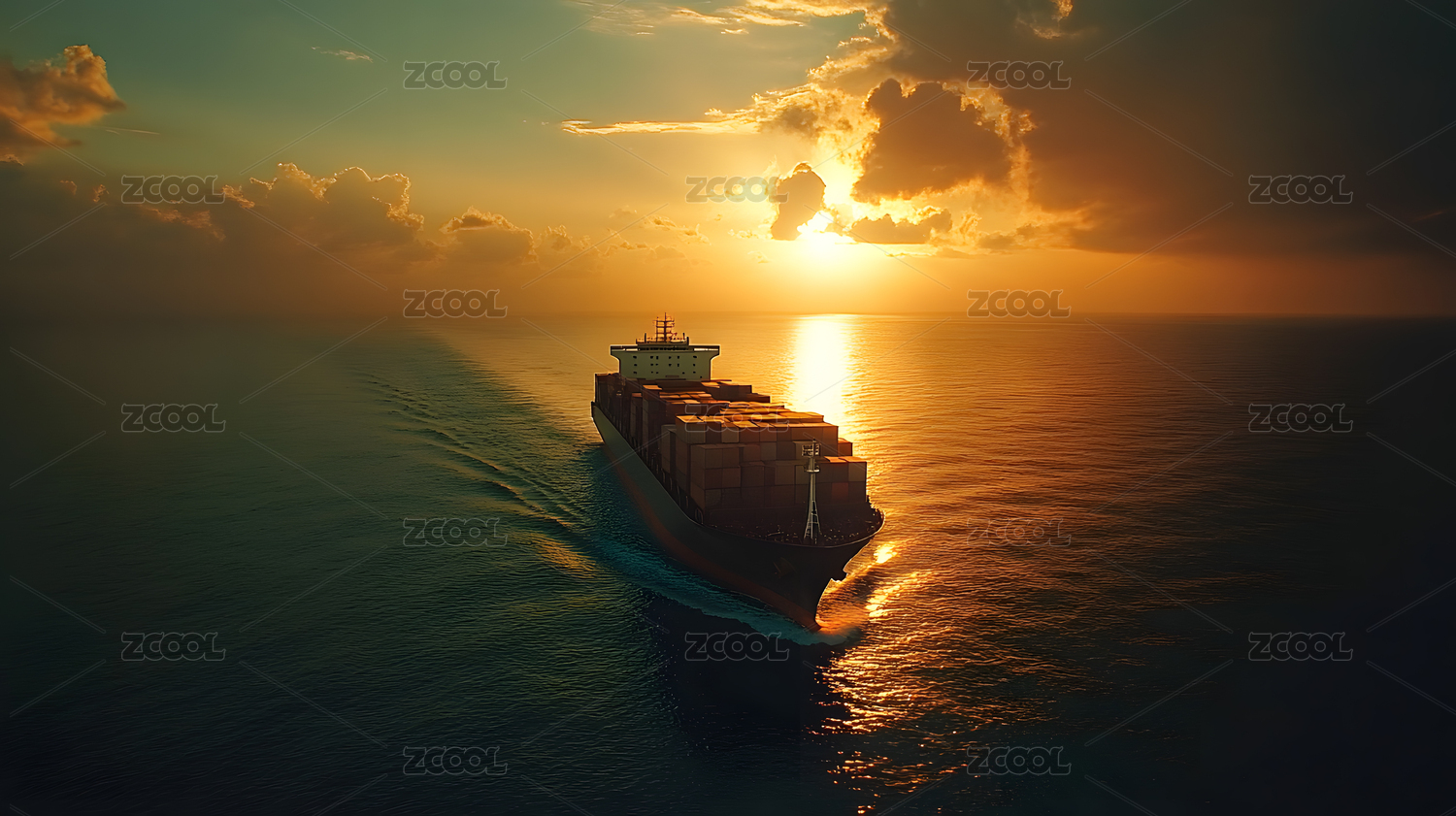 夕阳下大海中行驶的货轮背景