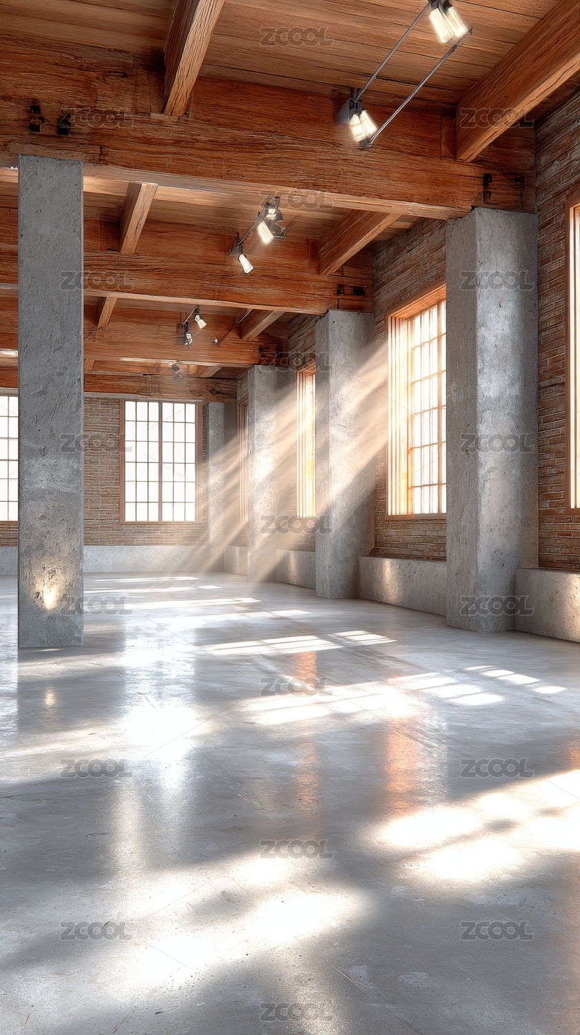 阳光照射的开放工业风室内空间