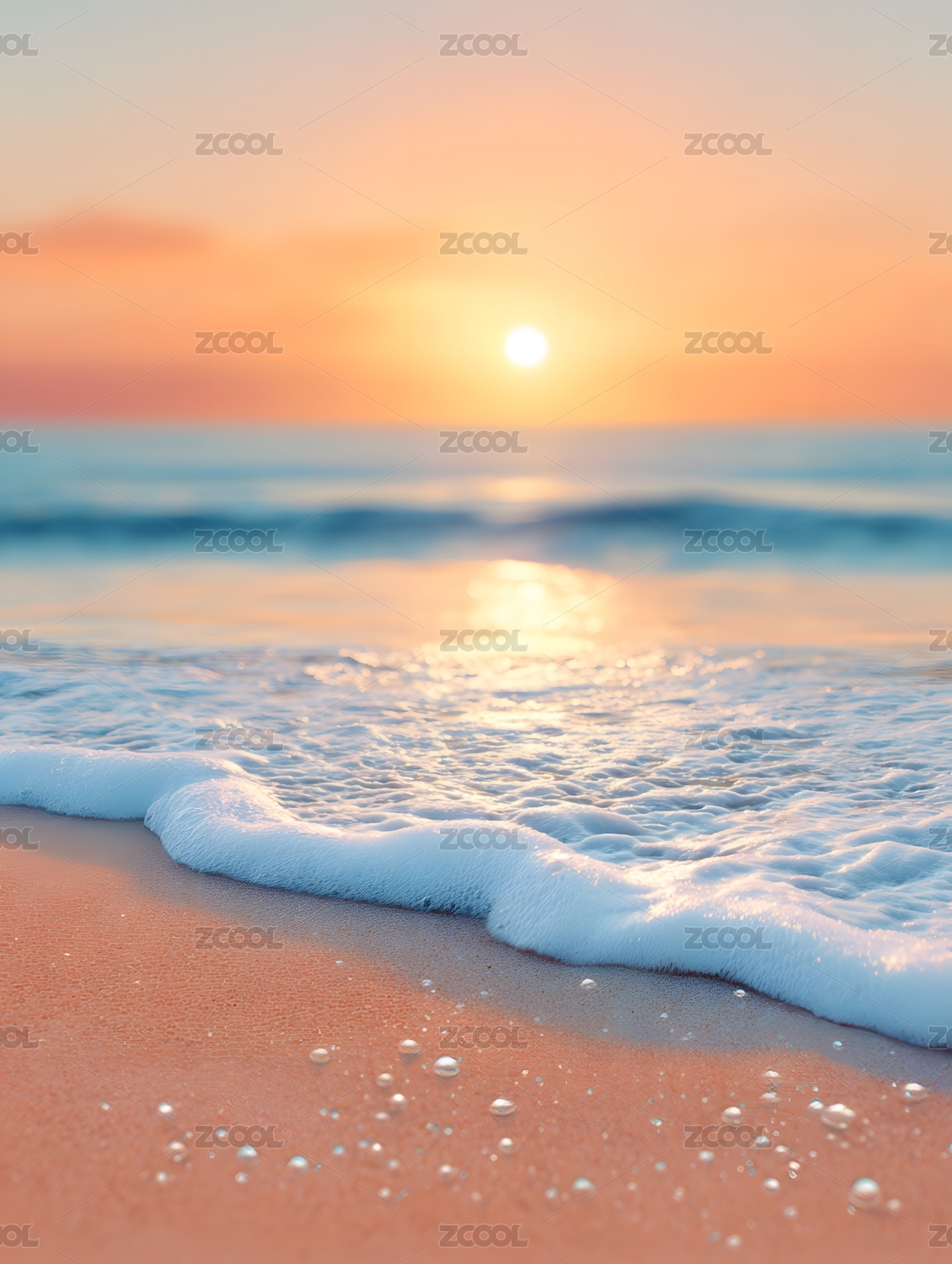 夕阳下海浪轻拍沙滩美景