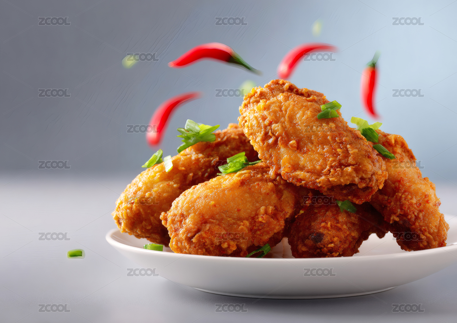炸鸡腿和辣椒飘浮空中