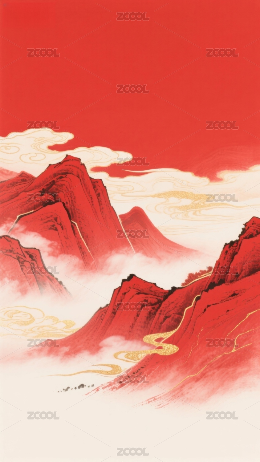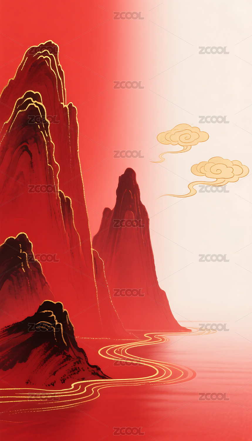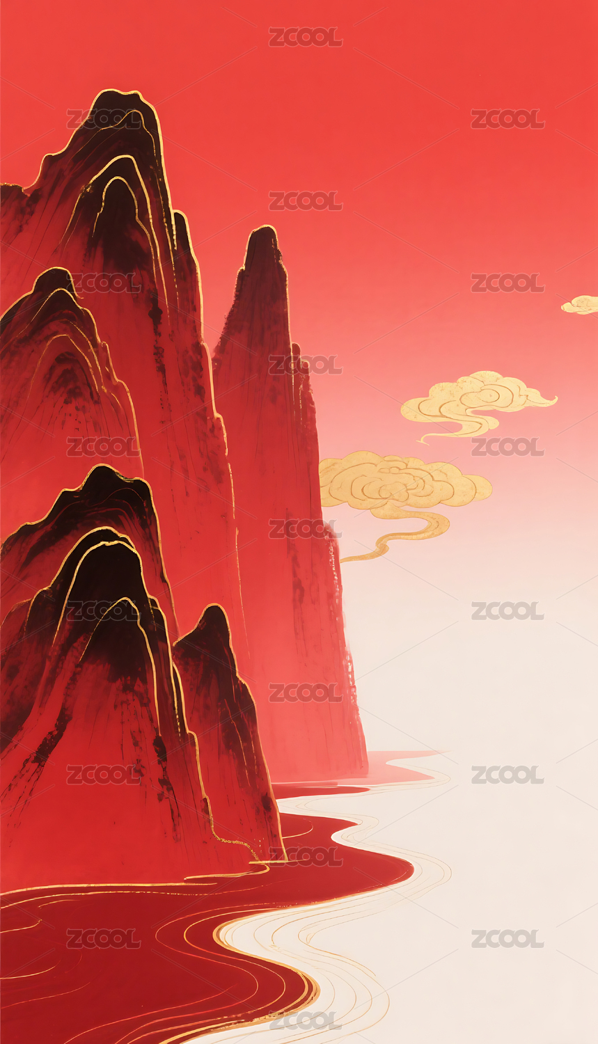 山水,红色背景,金色云朵,江河,山峦,传统绘画,中式风格,风景,云纹,古风