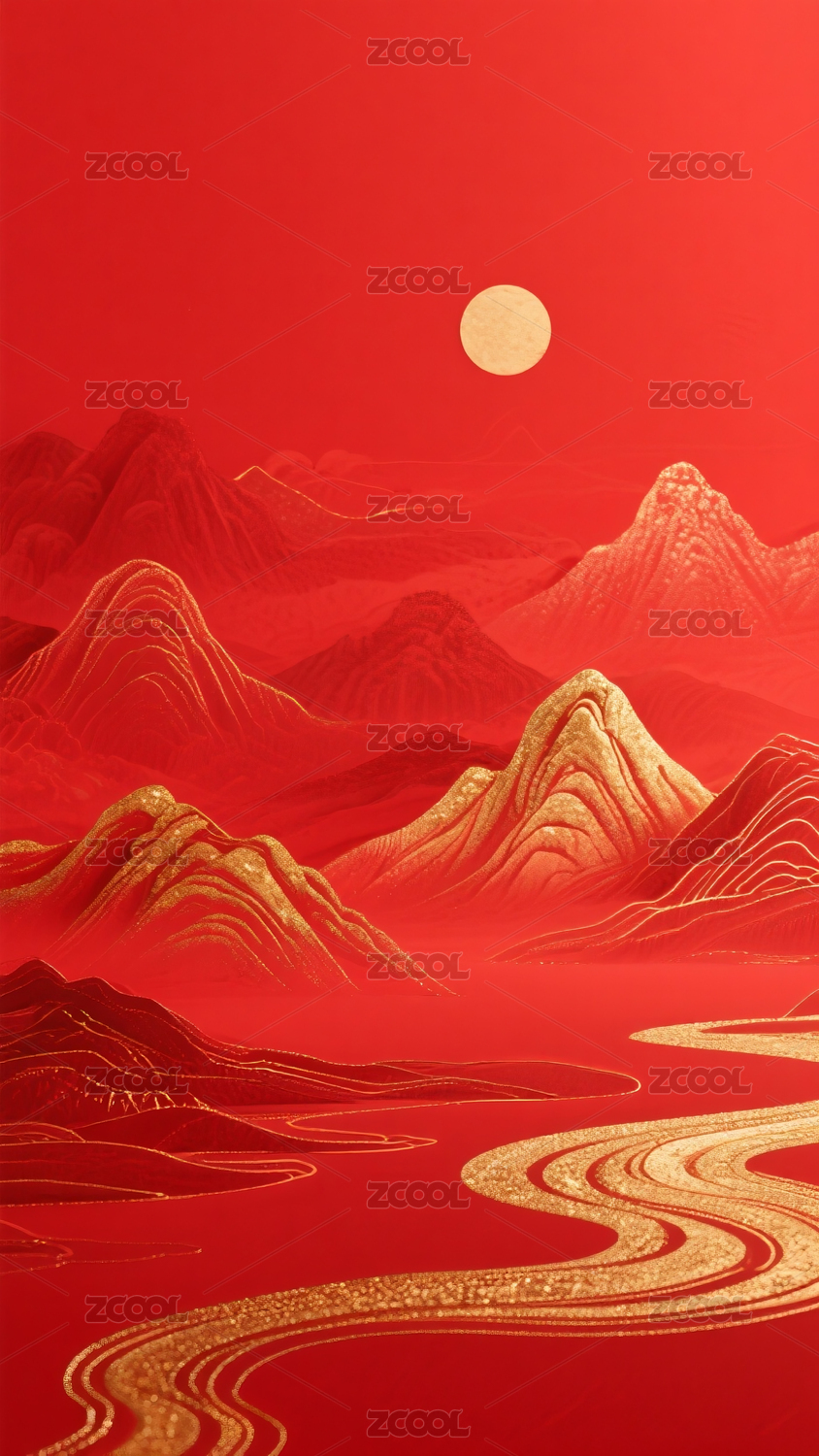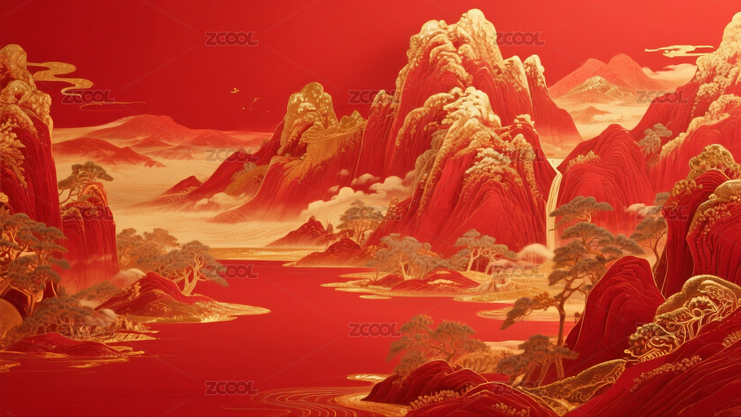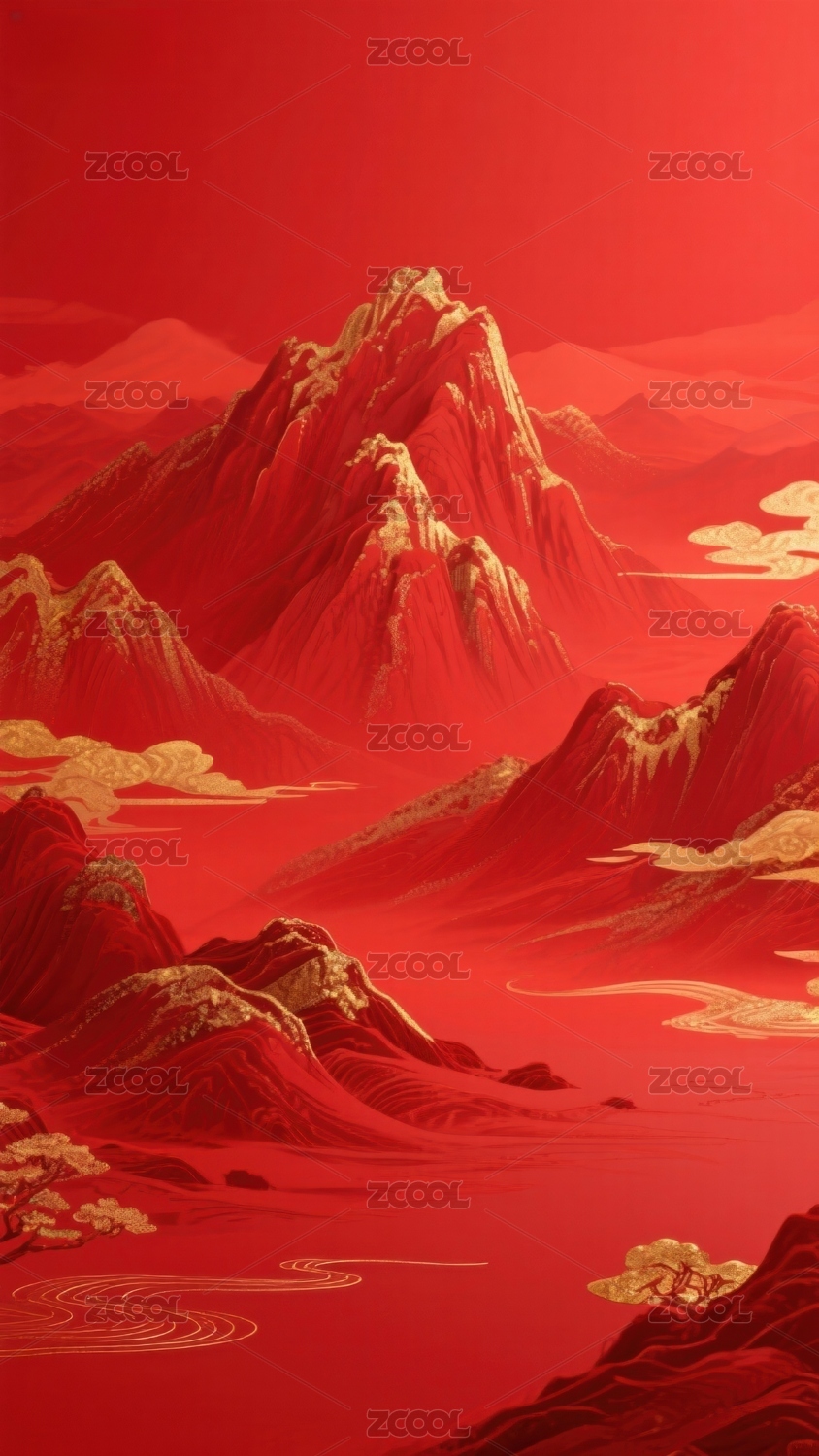 山水,红色背景,金色云朵,江河,山峦,传统绘画,中式风格,风景,云纹,古风