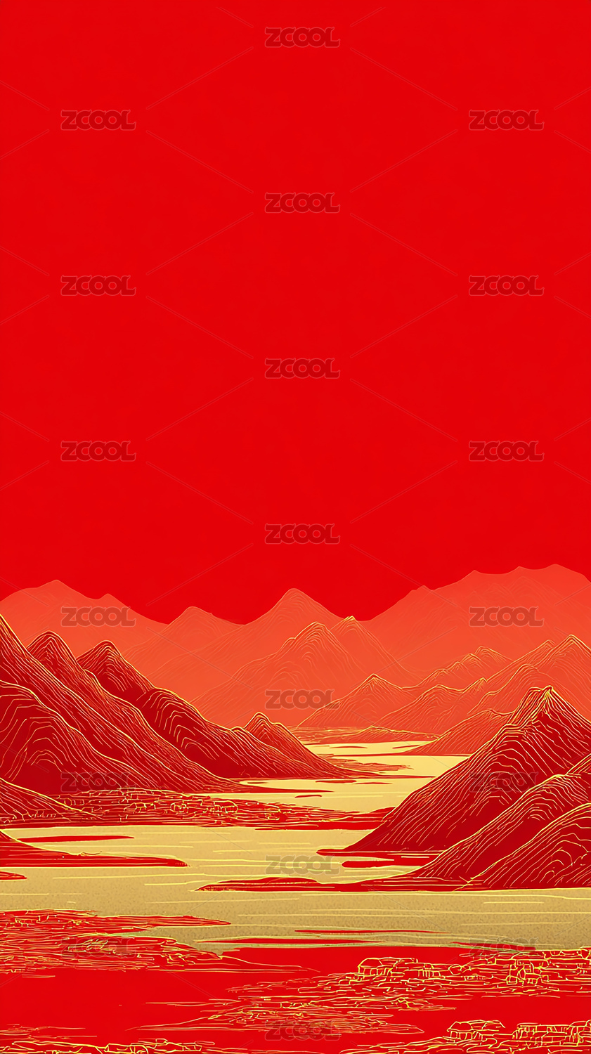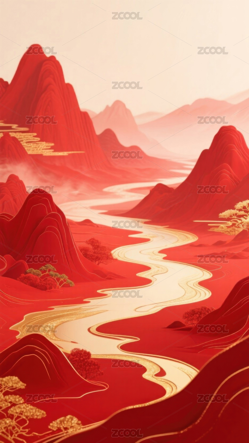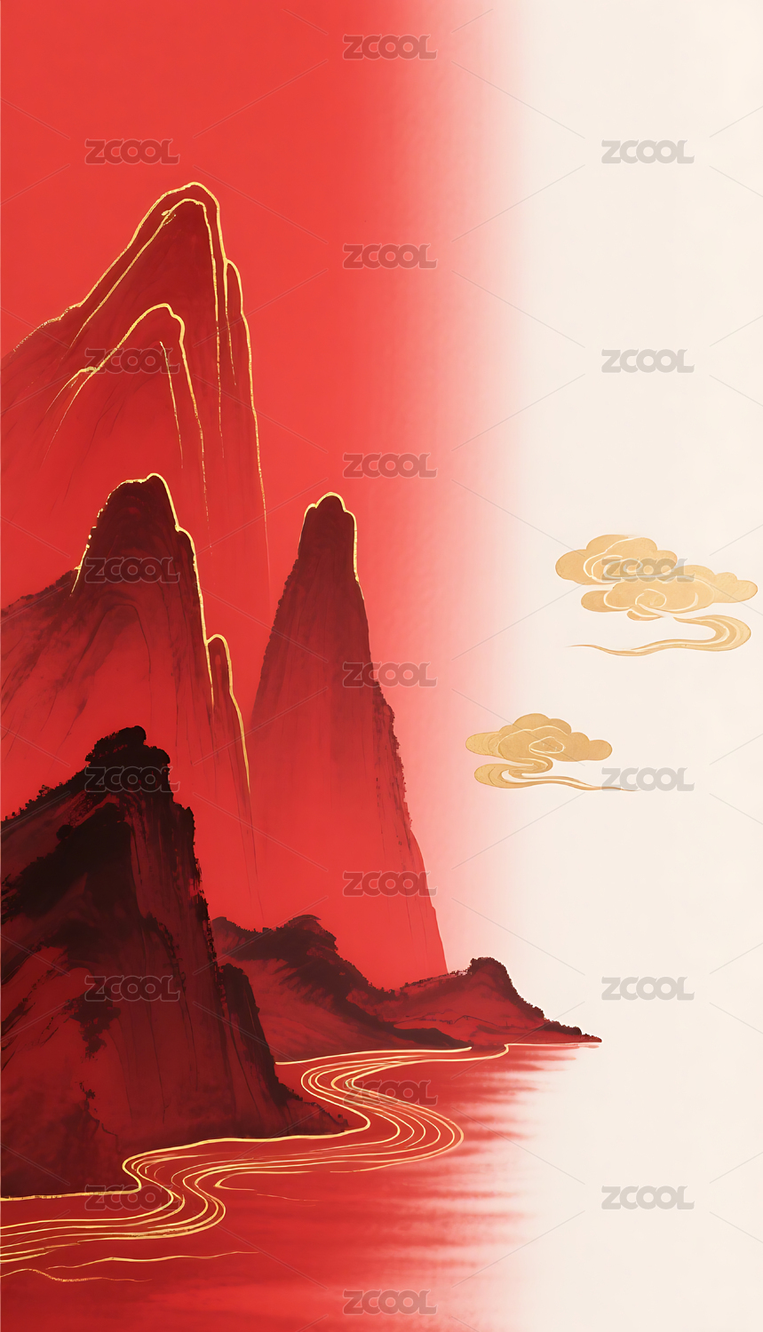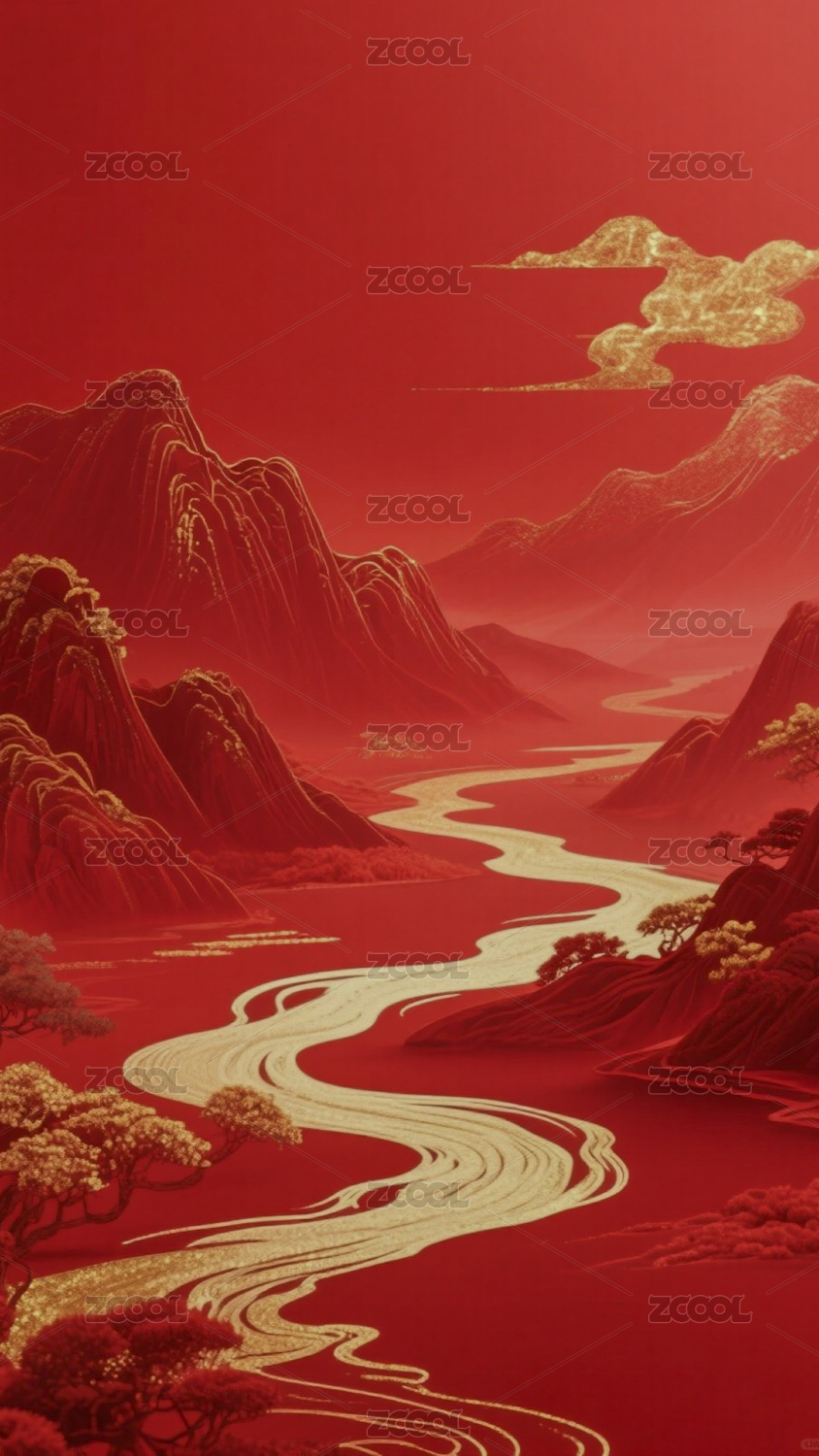 山水,红色背景,金色云朵,江河,山峦,传统绘画,中式风格,风景,云纹,古风