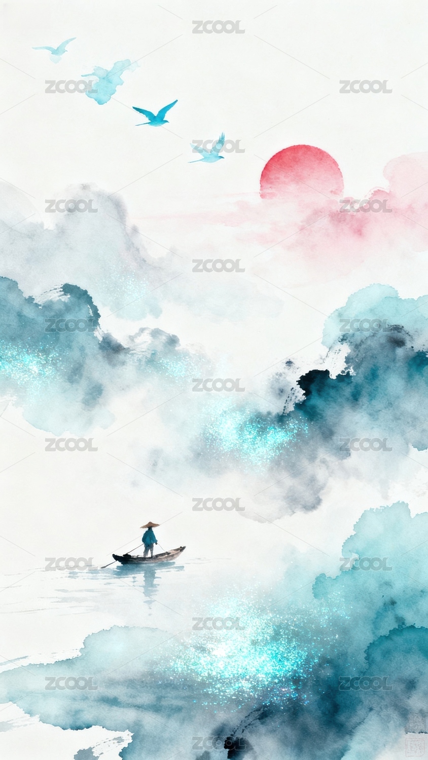 山水,水墨,月夜,小船,金色点缀,蓝色调,人物,风景,意境画