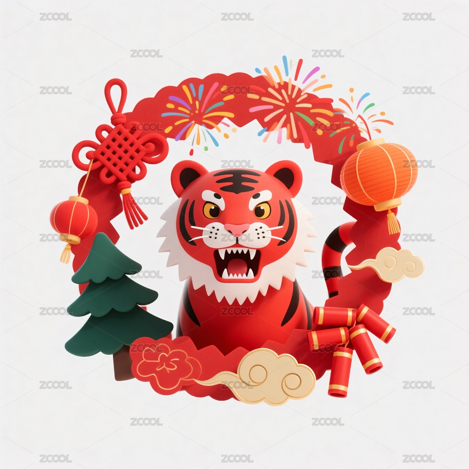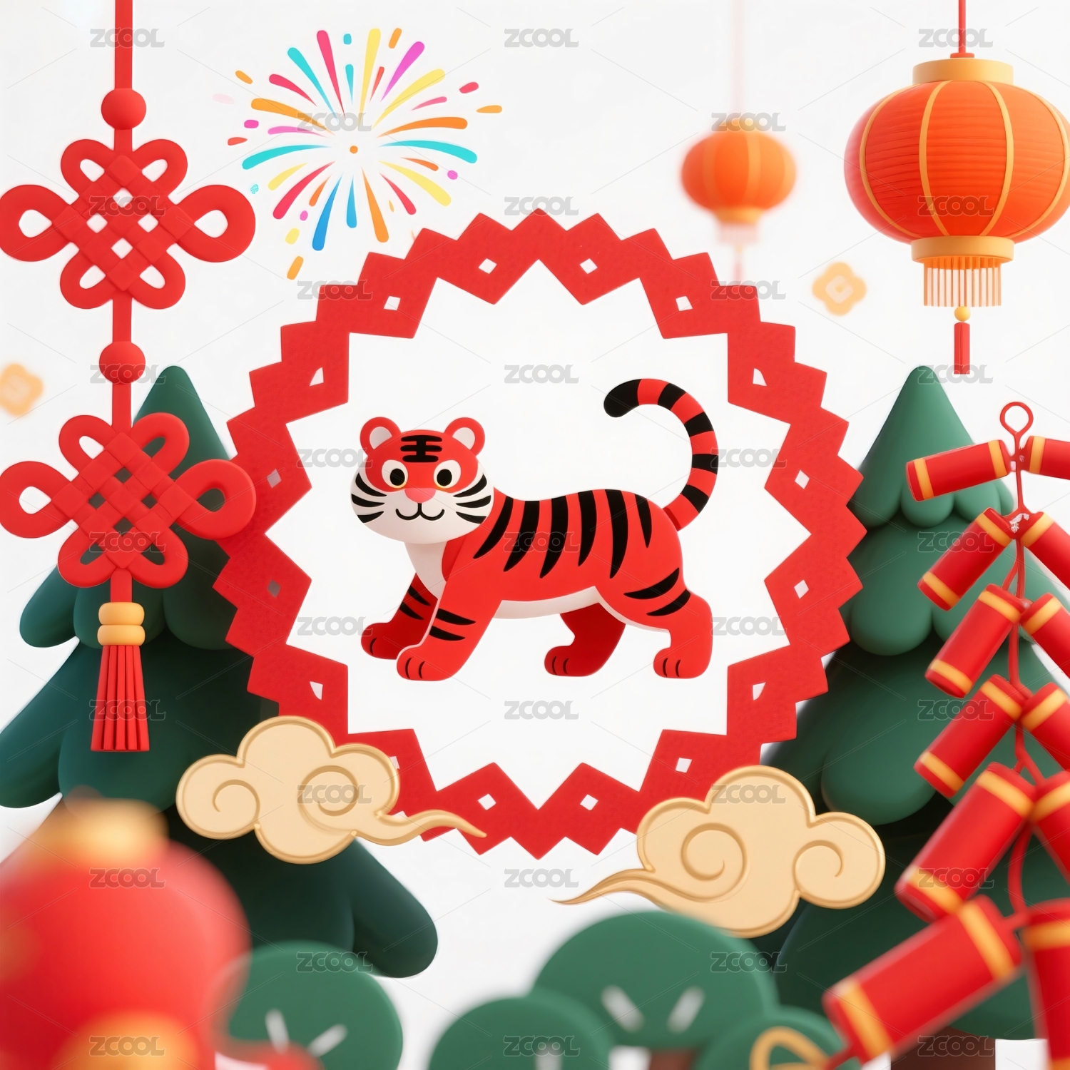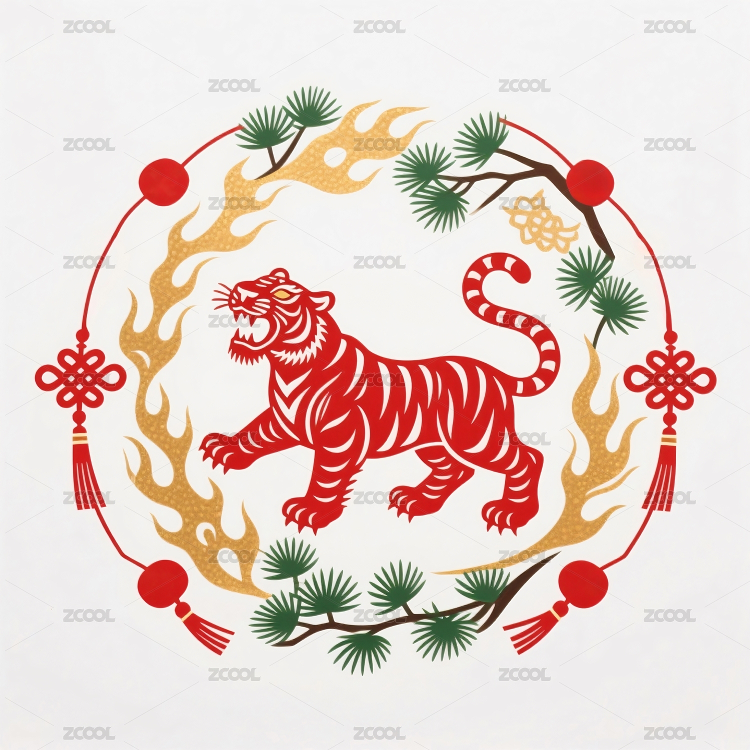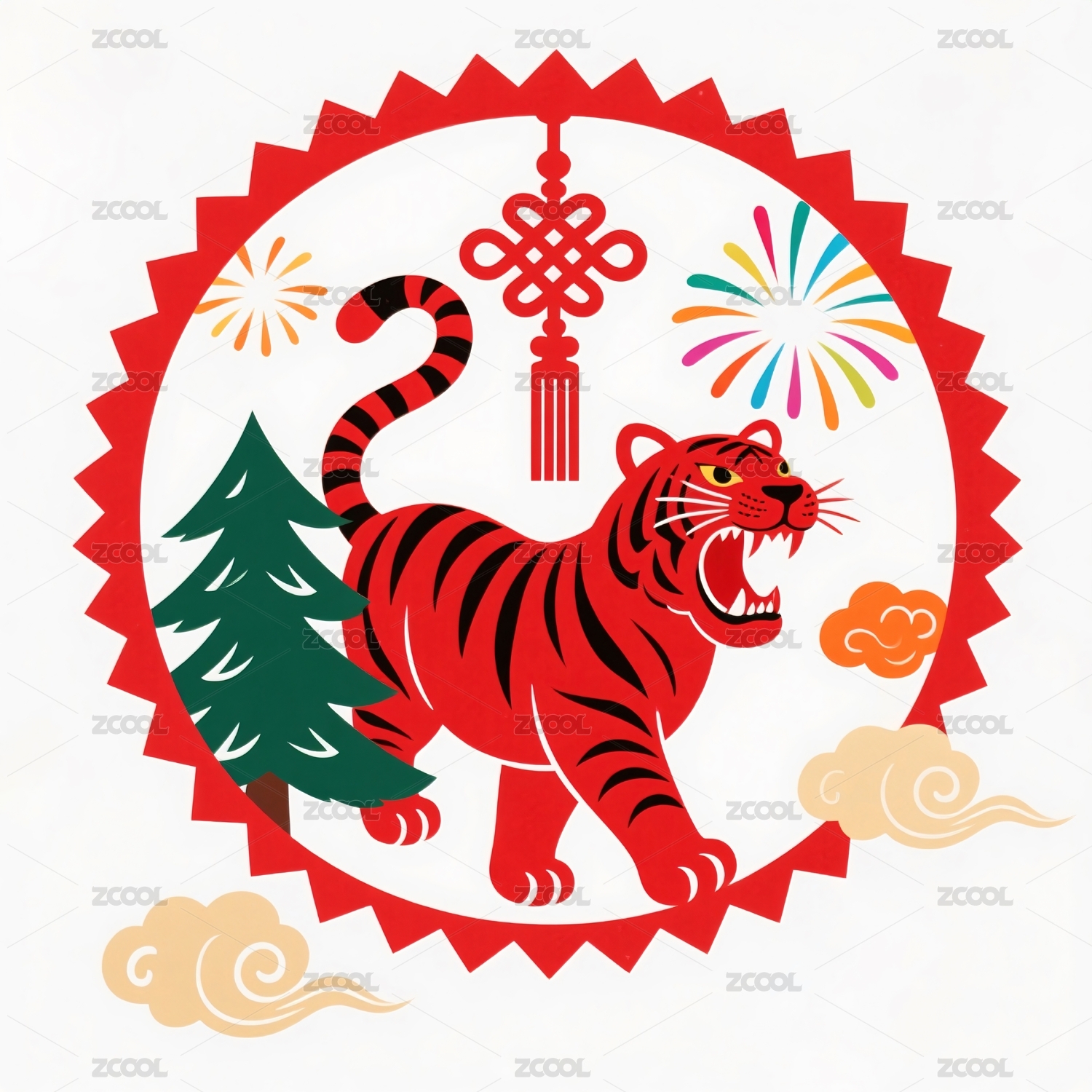 手绘卡通老虎矢量虎年复古国潮灯笼插画