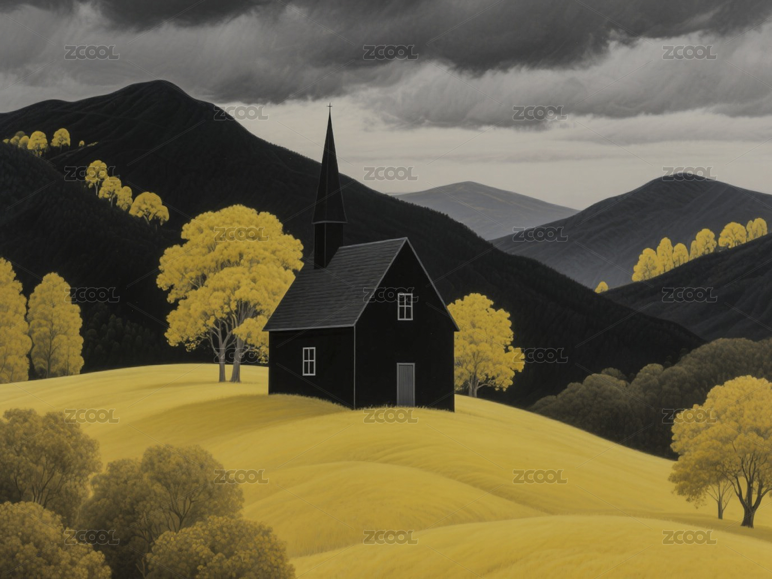 彩色的丘陵风景与教堂