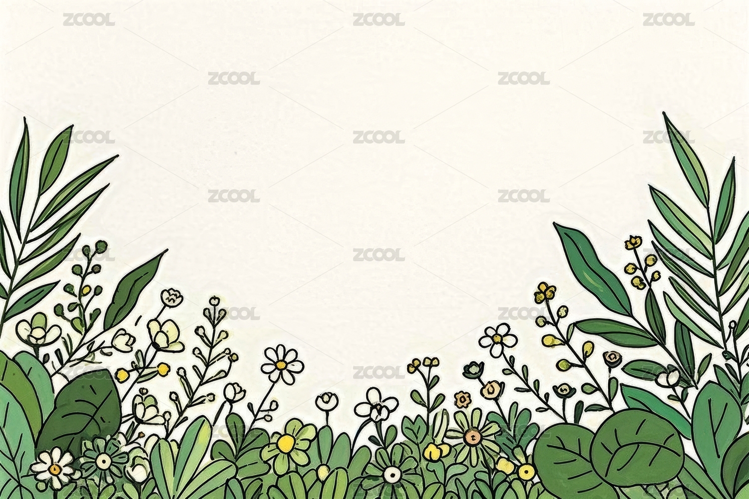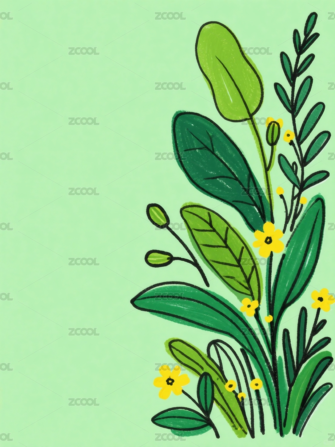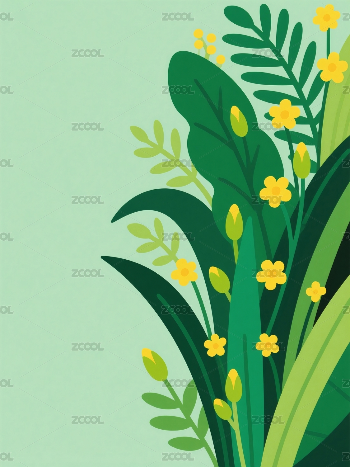绿色植物叶片花朵构成插画