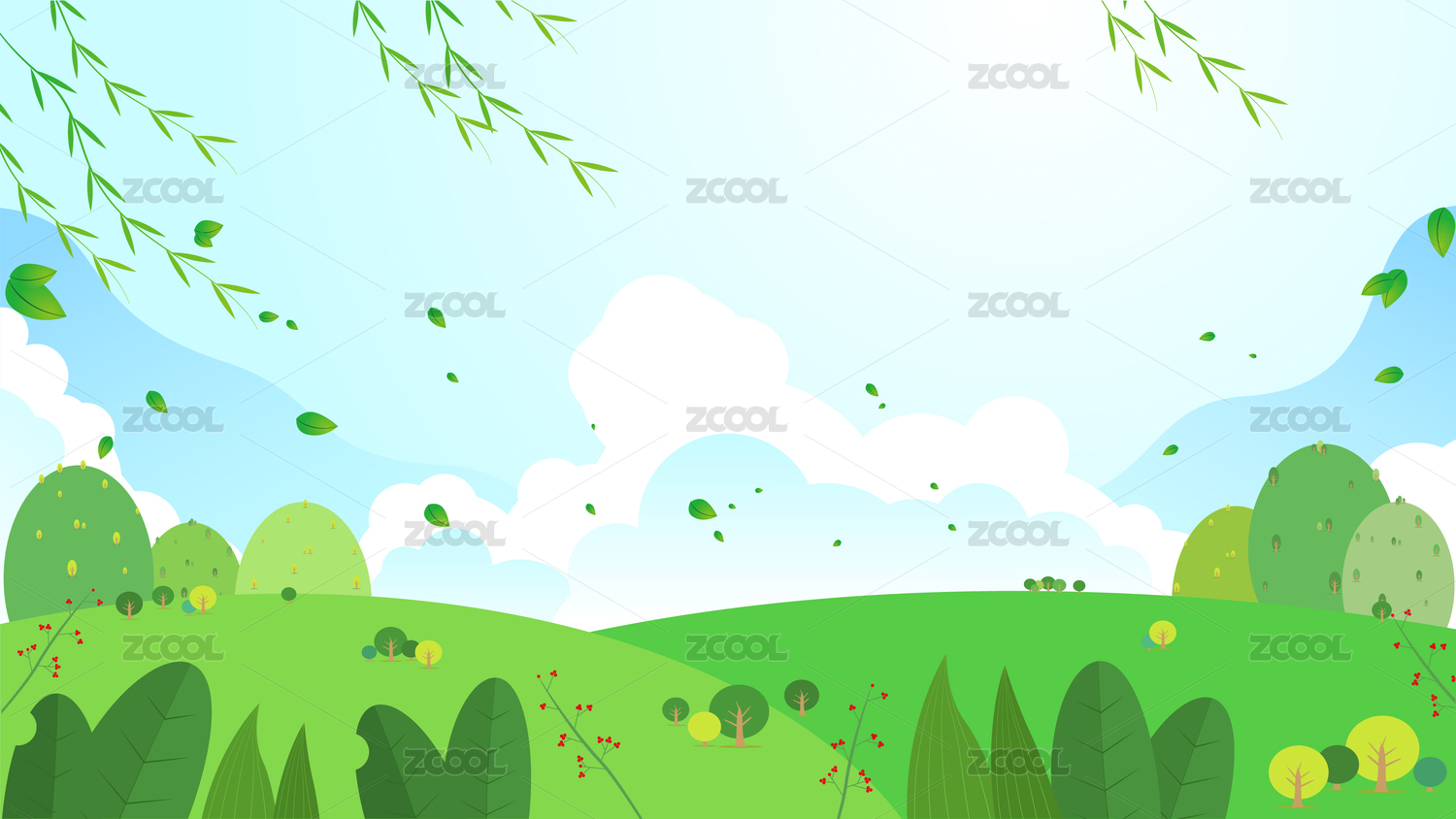 春天,秋天,卡通,田园,风光,草地,绿色,山丘,天空,白云