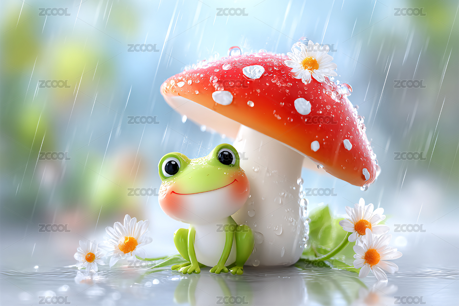 青蛙,蘑菇,雨天,可爱,童话,卡通,治愈,清新,水滴,花朵