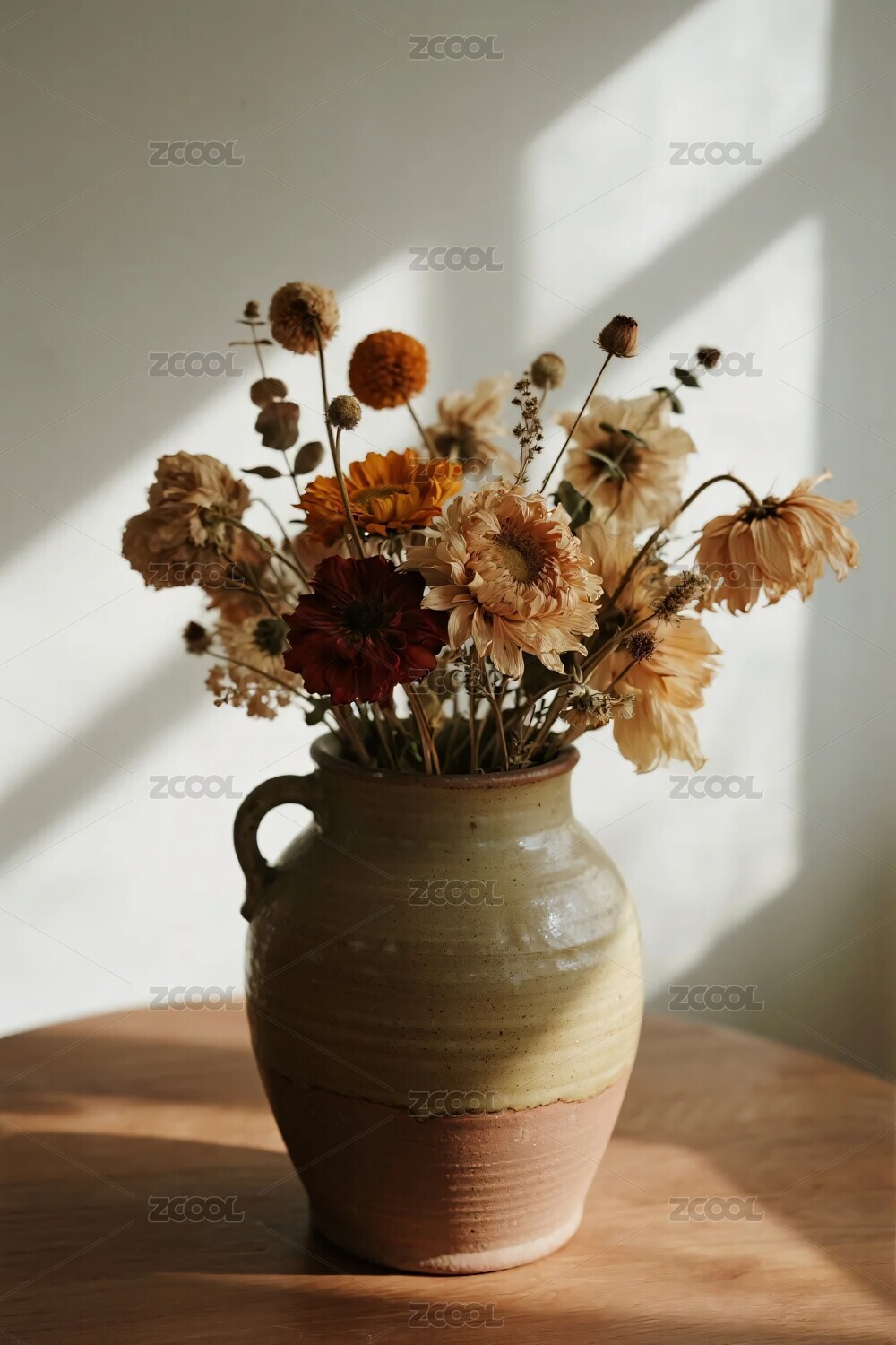 光线,背景,干花,陶罐,花瓶,植物,红色,枝条,墙面,木桌