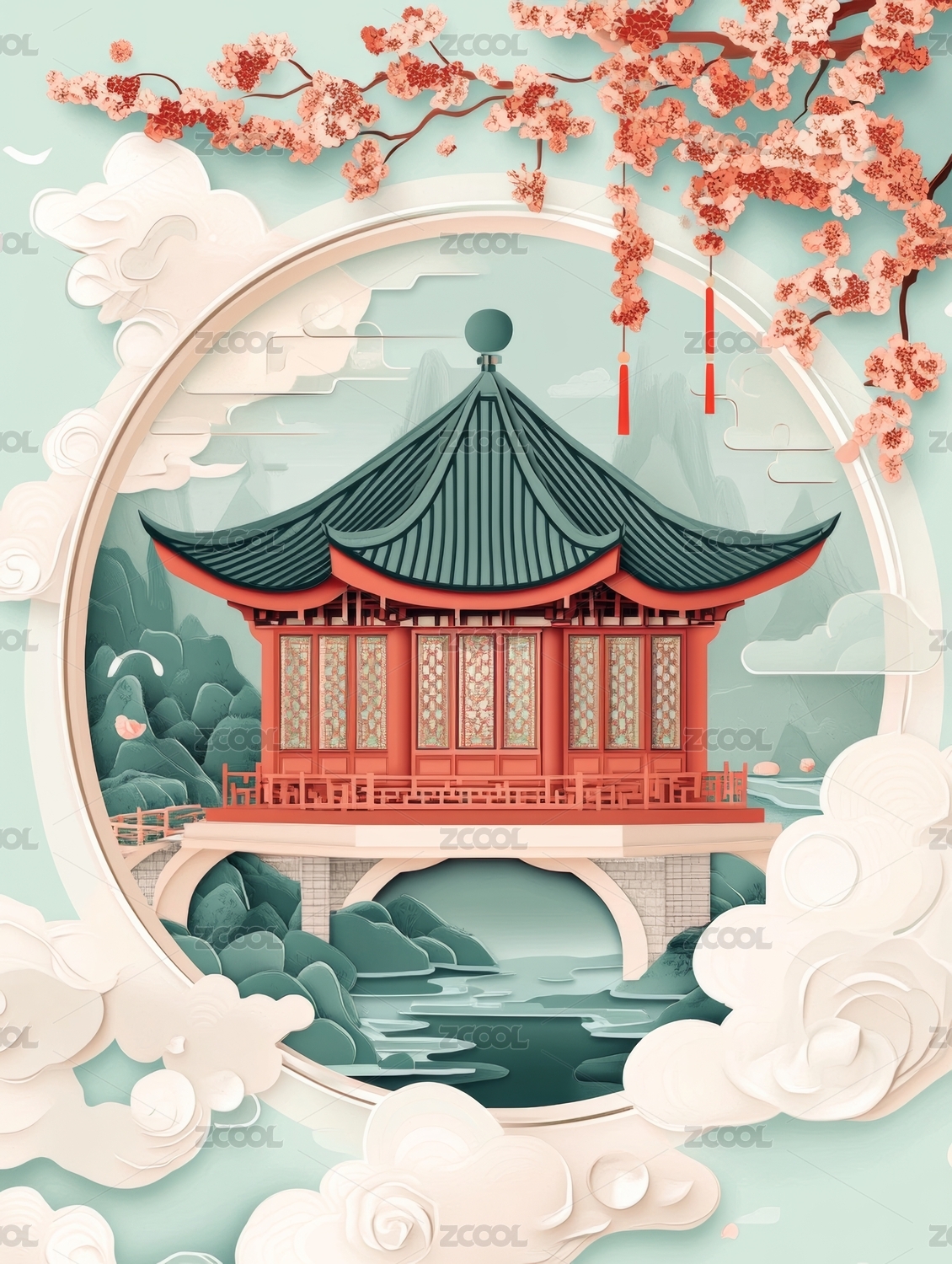 剪纸风格中式庭院海报