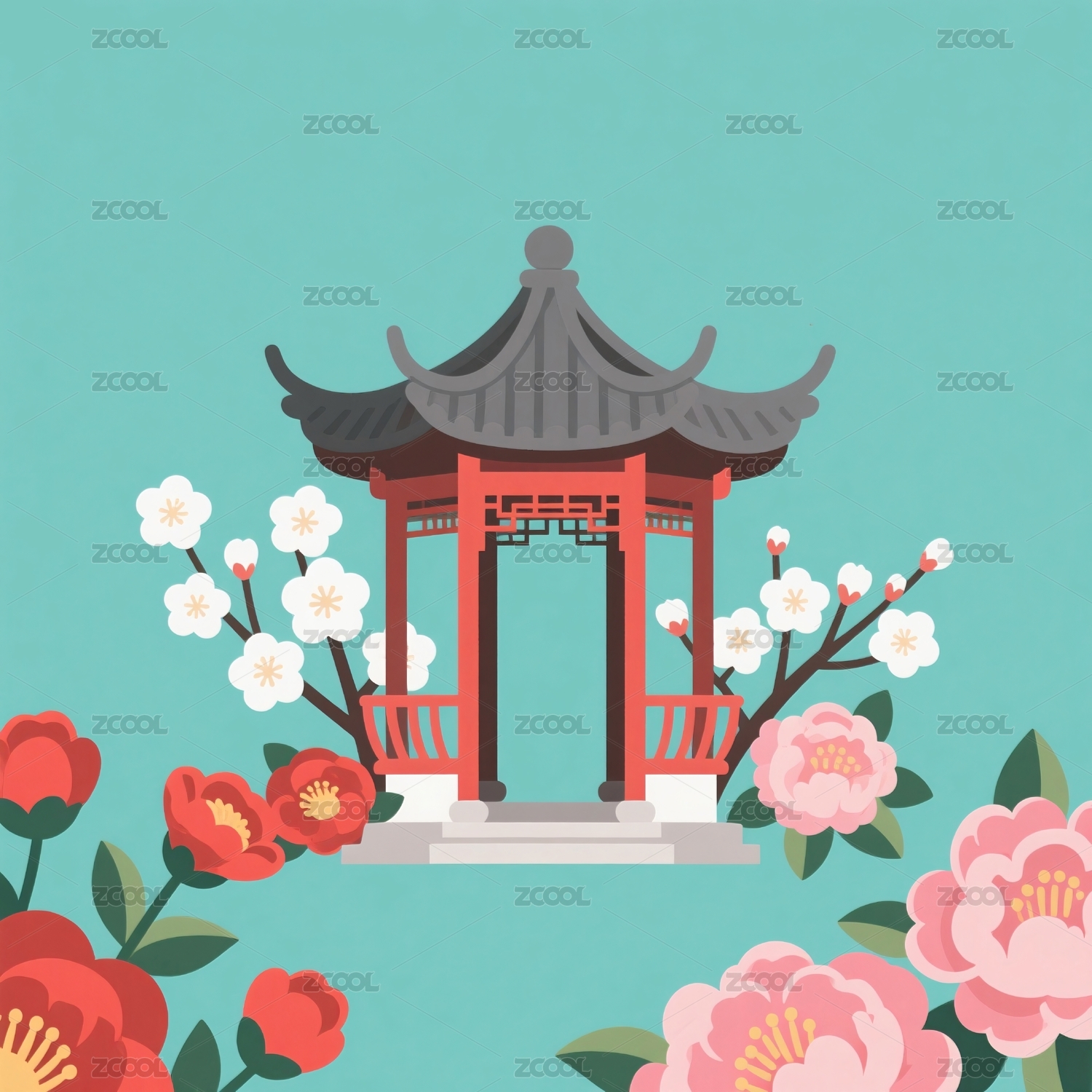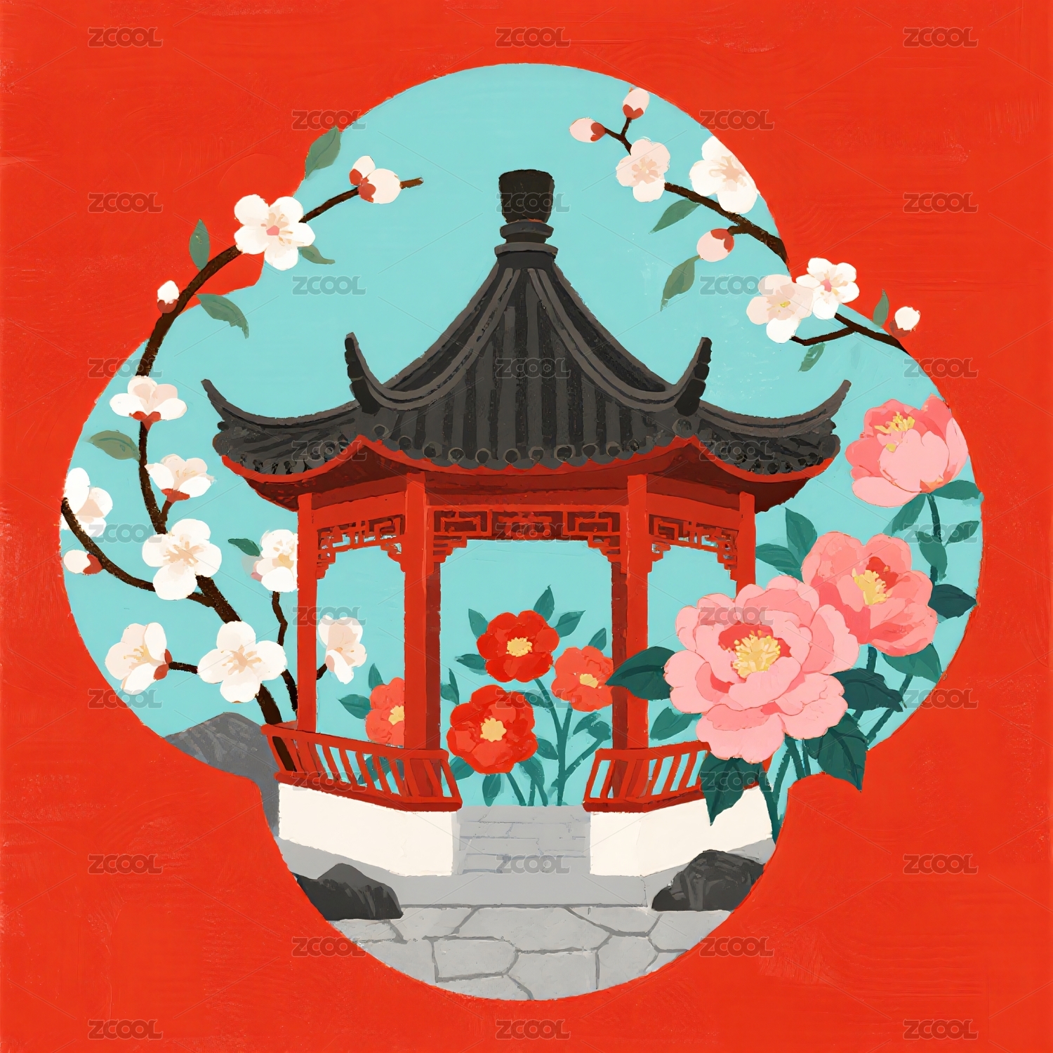 亭台花卉环绕蓝底构成