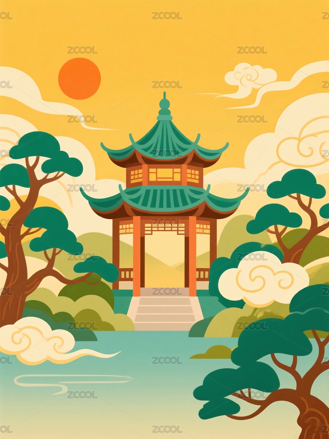 亭台楼阁树木云霞景色