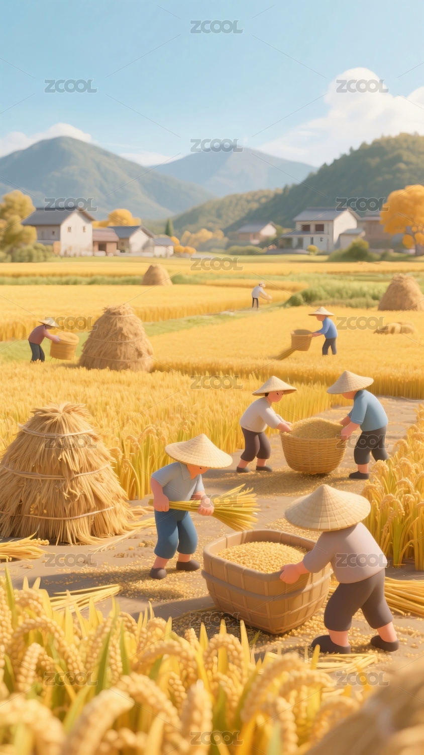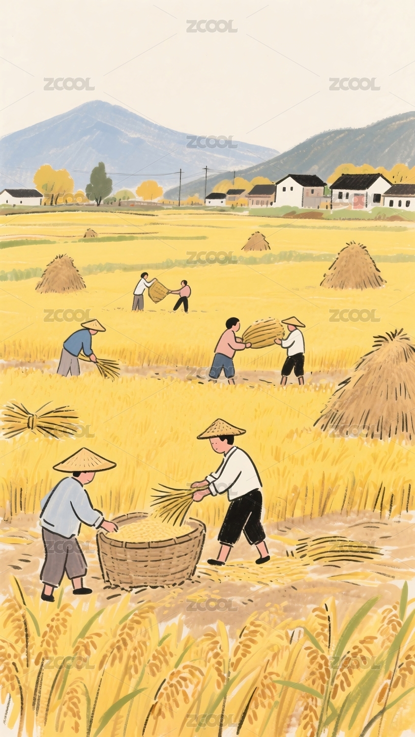 秋日稻田丰收景象劳作图