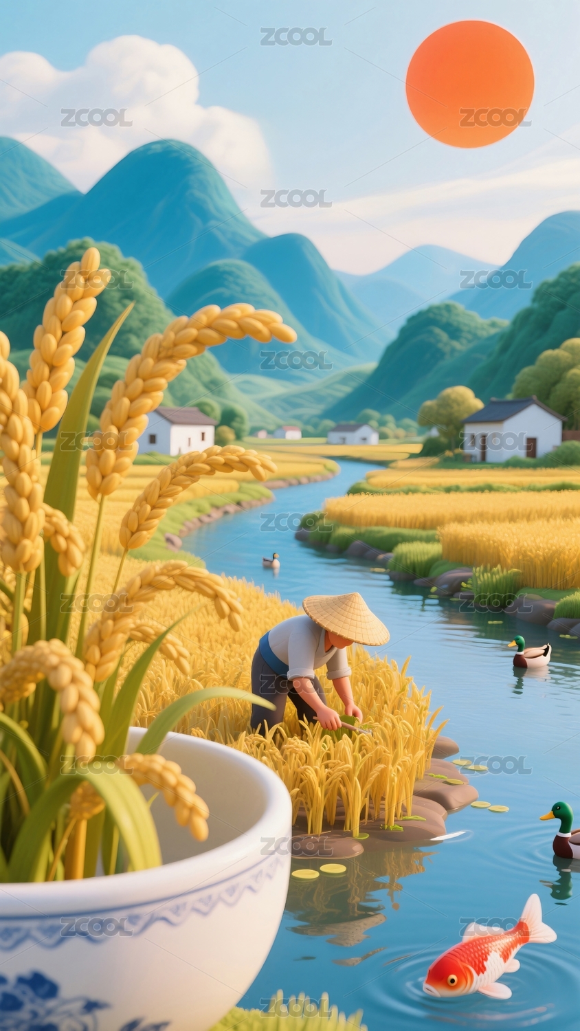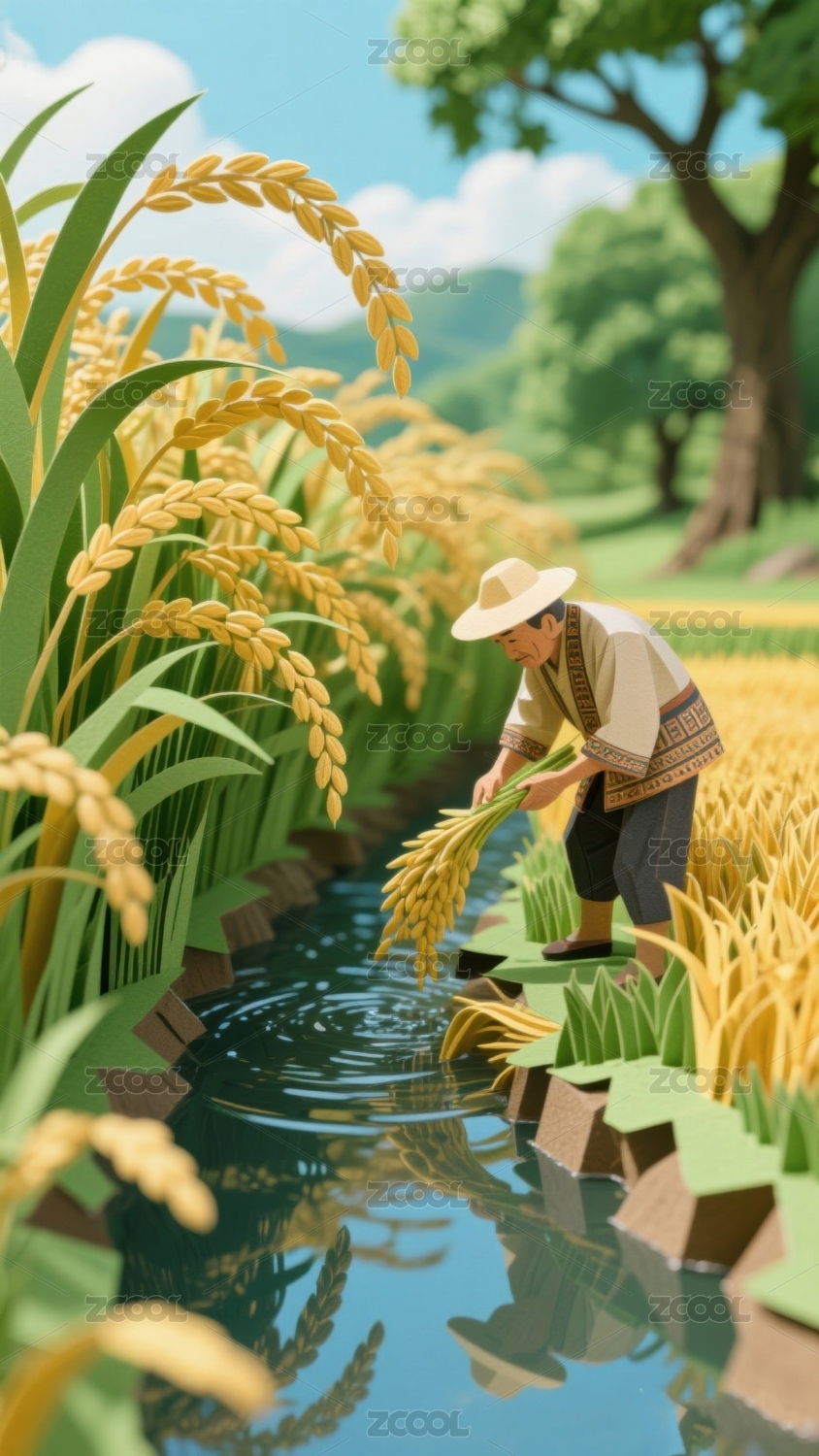 稻田河流农夫收获场景