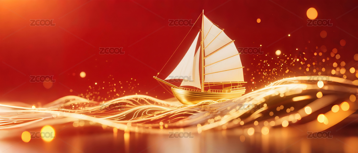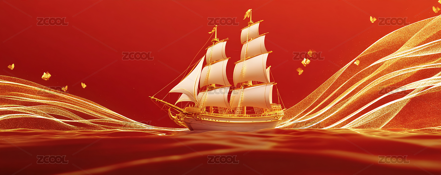 喜庆红底金浪帆船背景