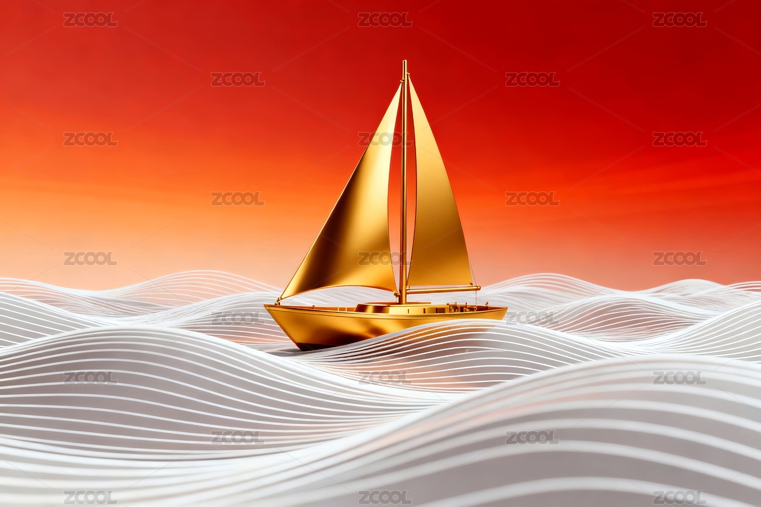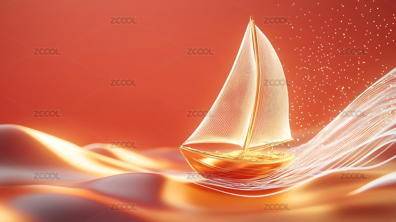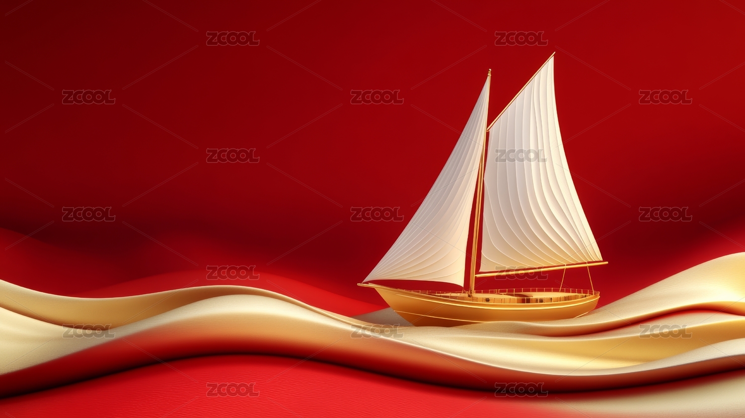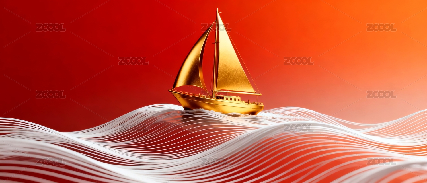 金色帆船与红色波浪