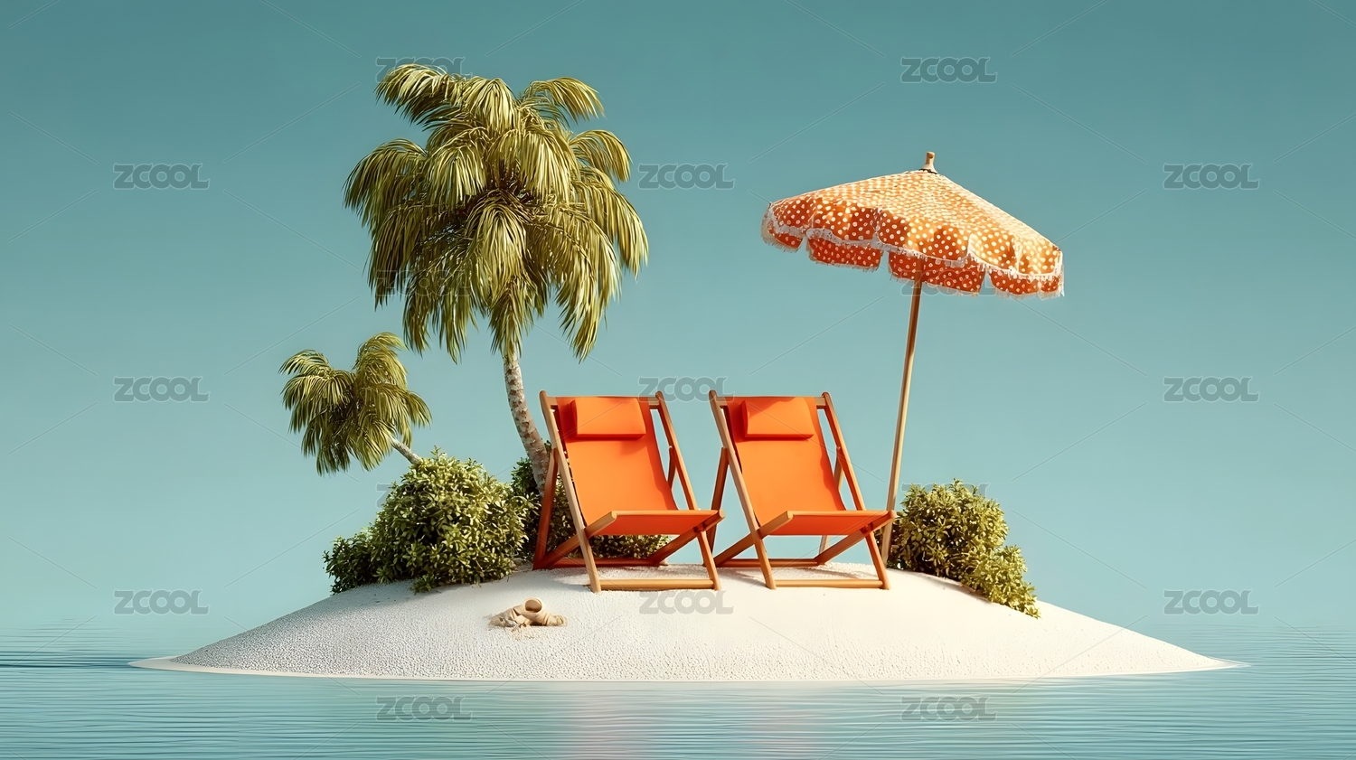 夏天热带海边棕榈树下的皮箱3D立体插画