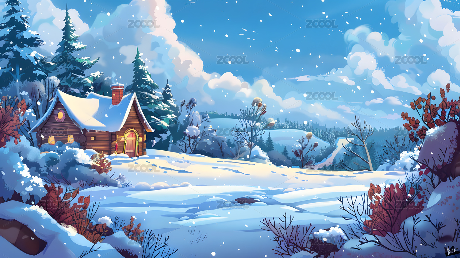 冬天雪地里的小木屋插画