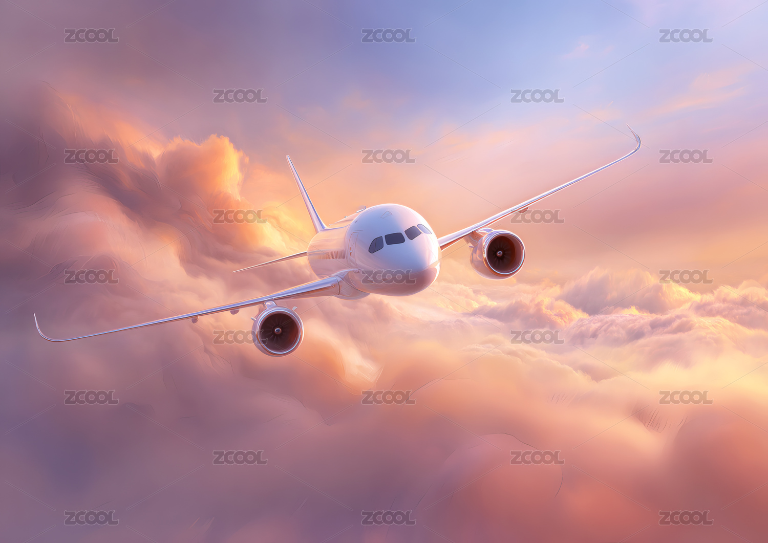 飞机翱翔于粉色云海