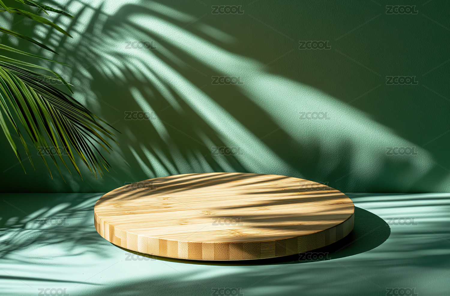 圆形托盘,木质纹理,深棕色,绿色背景,热带植物,自然风格,简约设计,展示台,静物摄影,木质材料