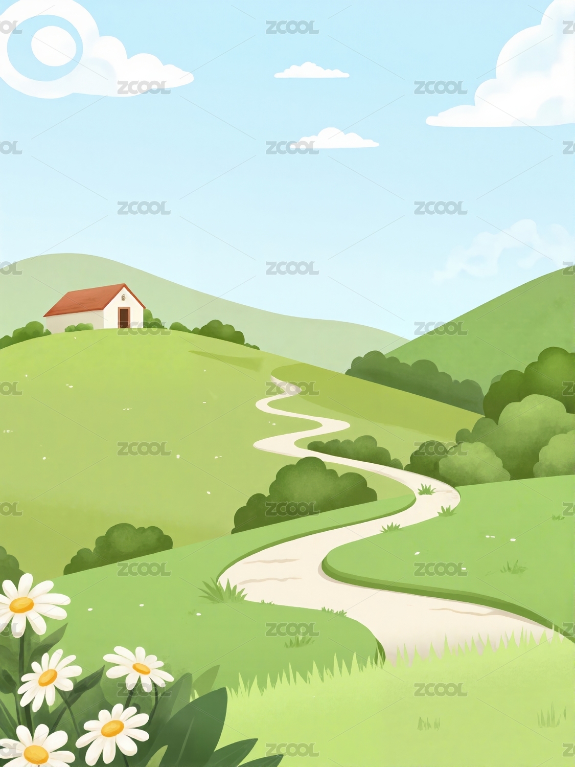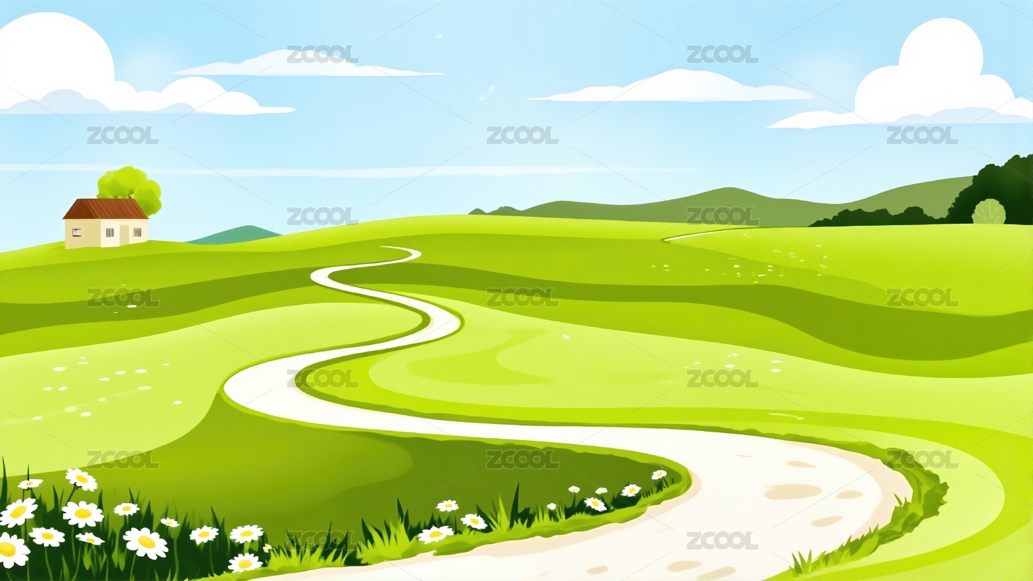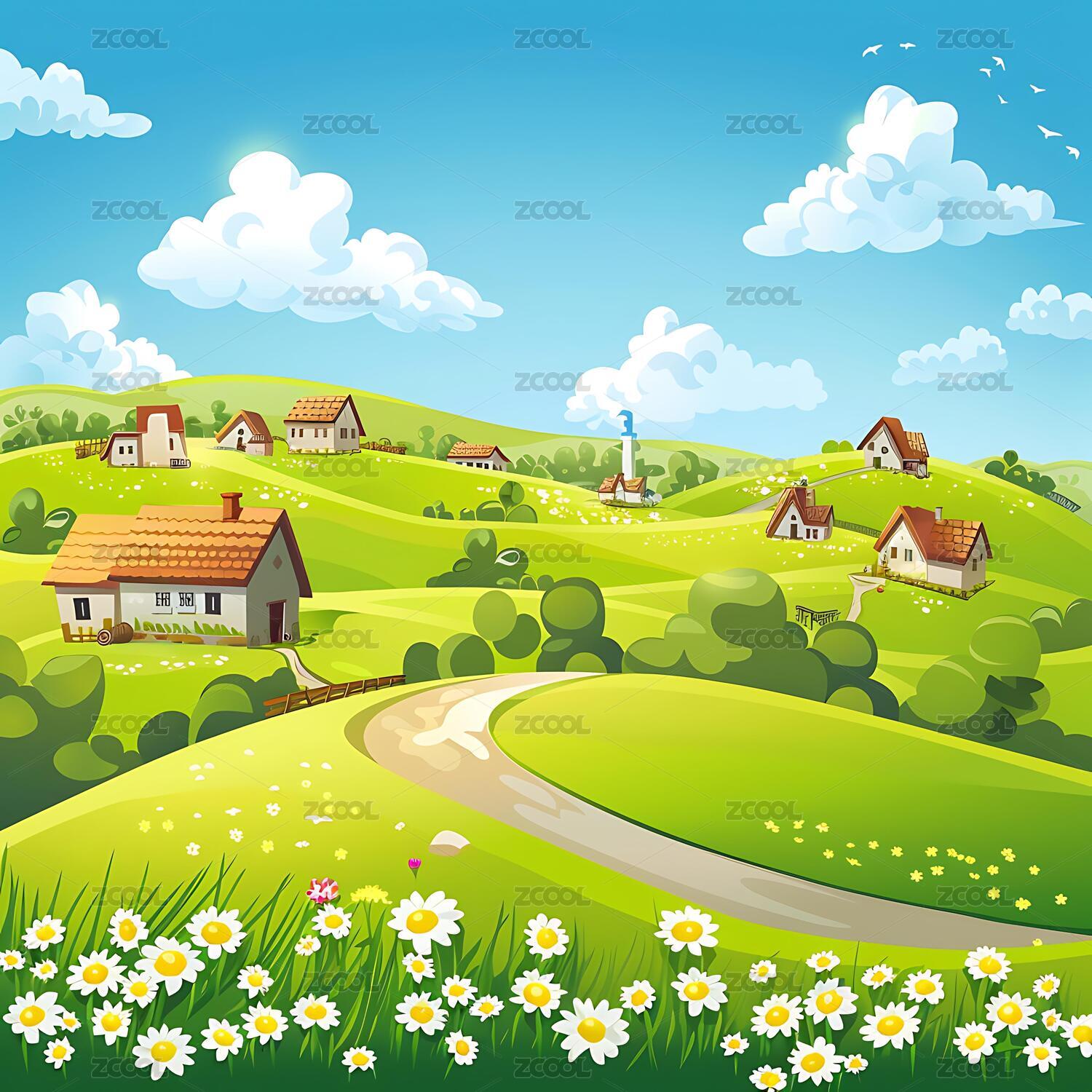 田园,乡村,风景,绿色,山丘,小路,房屋,白云,蓝天,草地