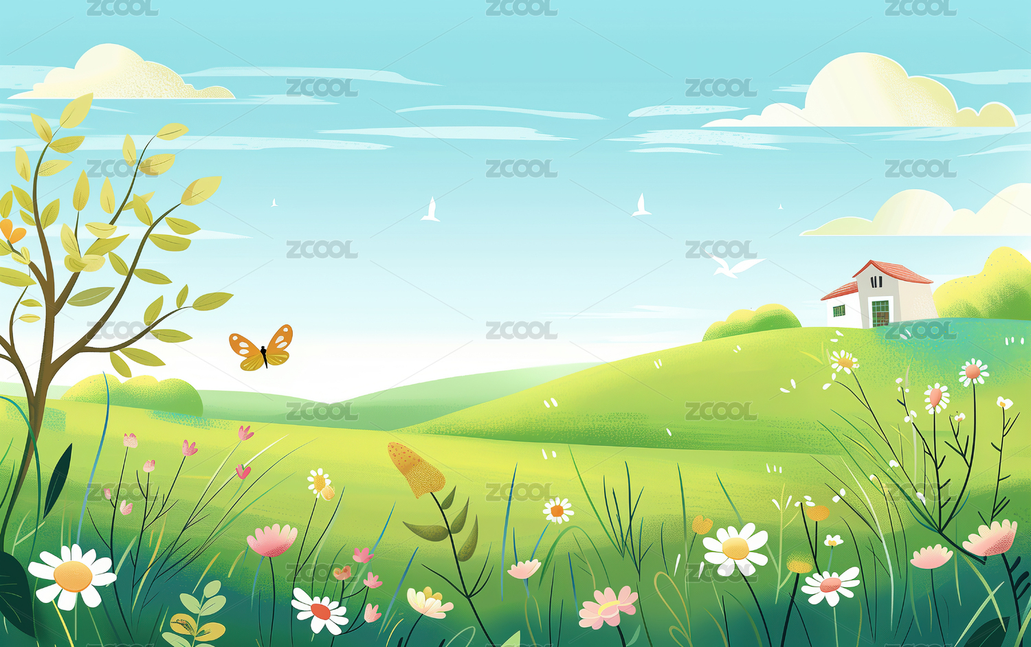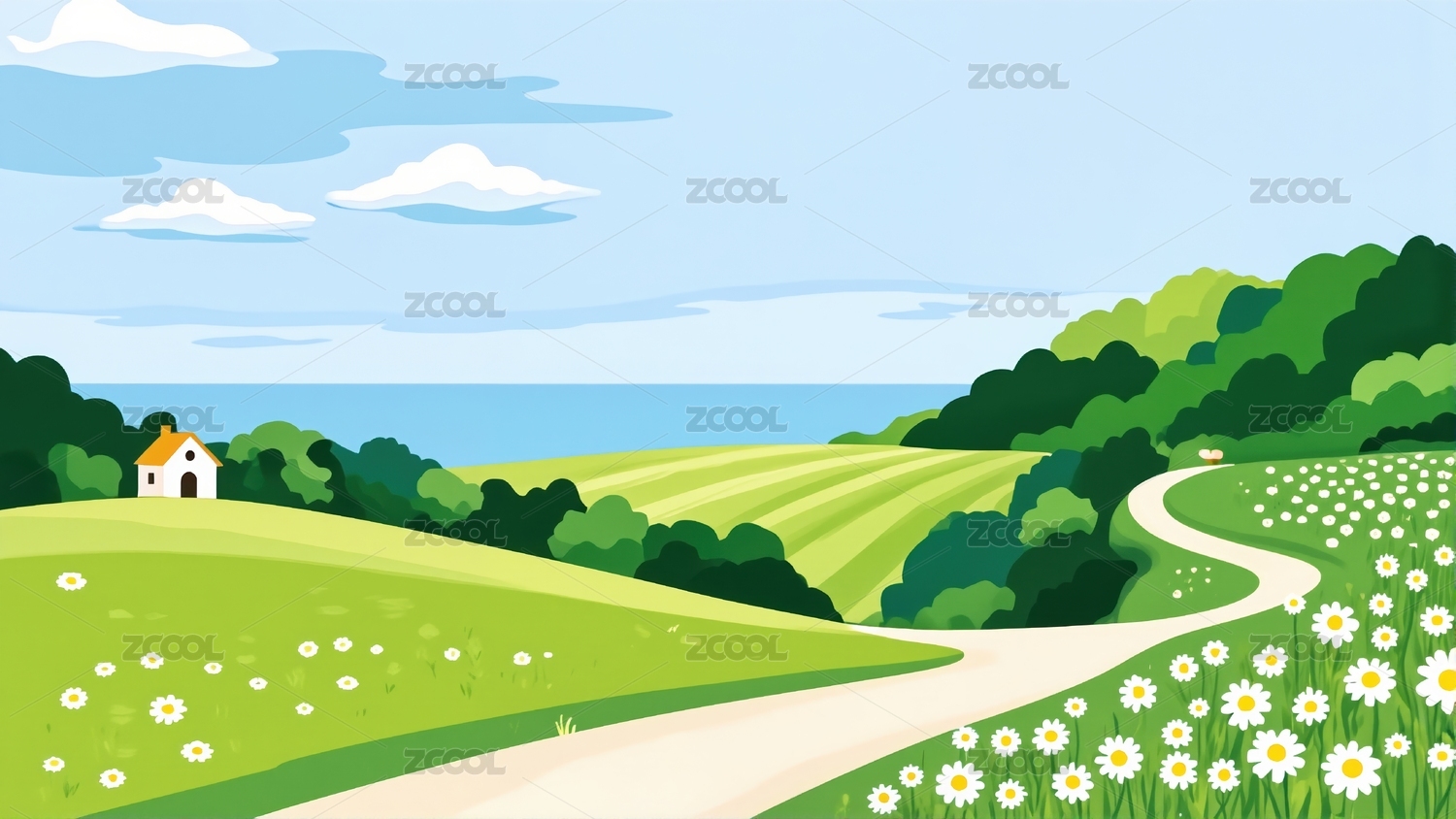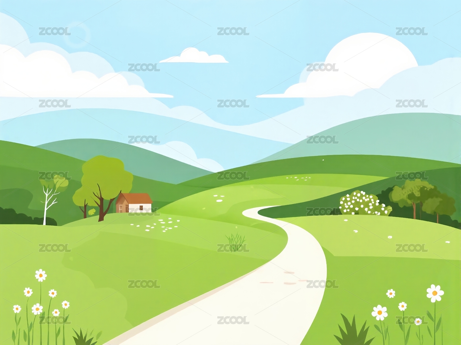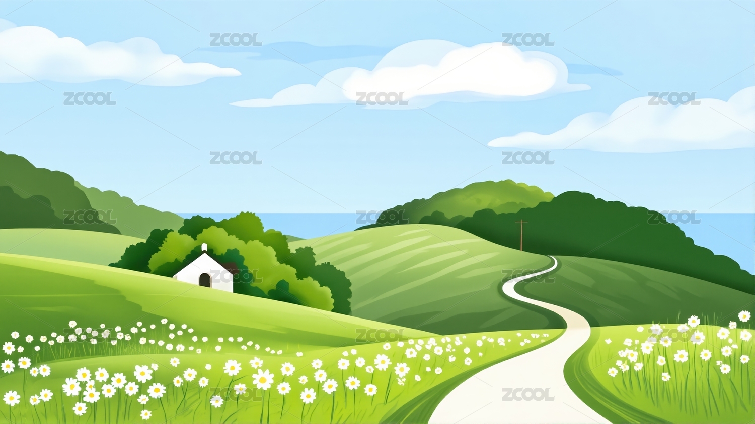 田园,乡村,风景,绿色,山丘,小路,房屋,白云,蓝天,草地