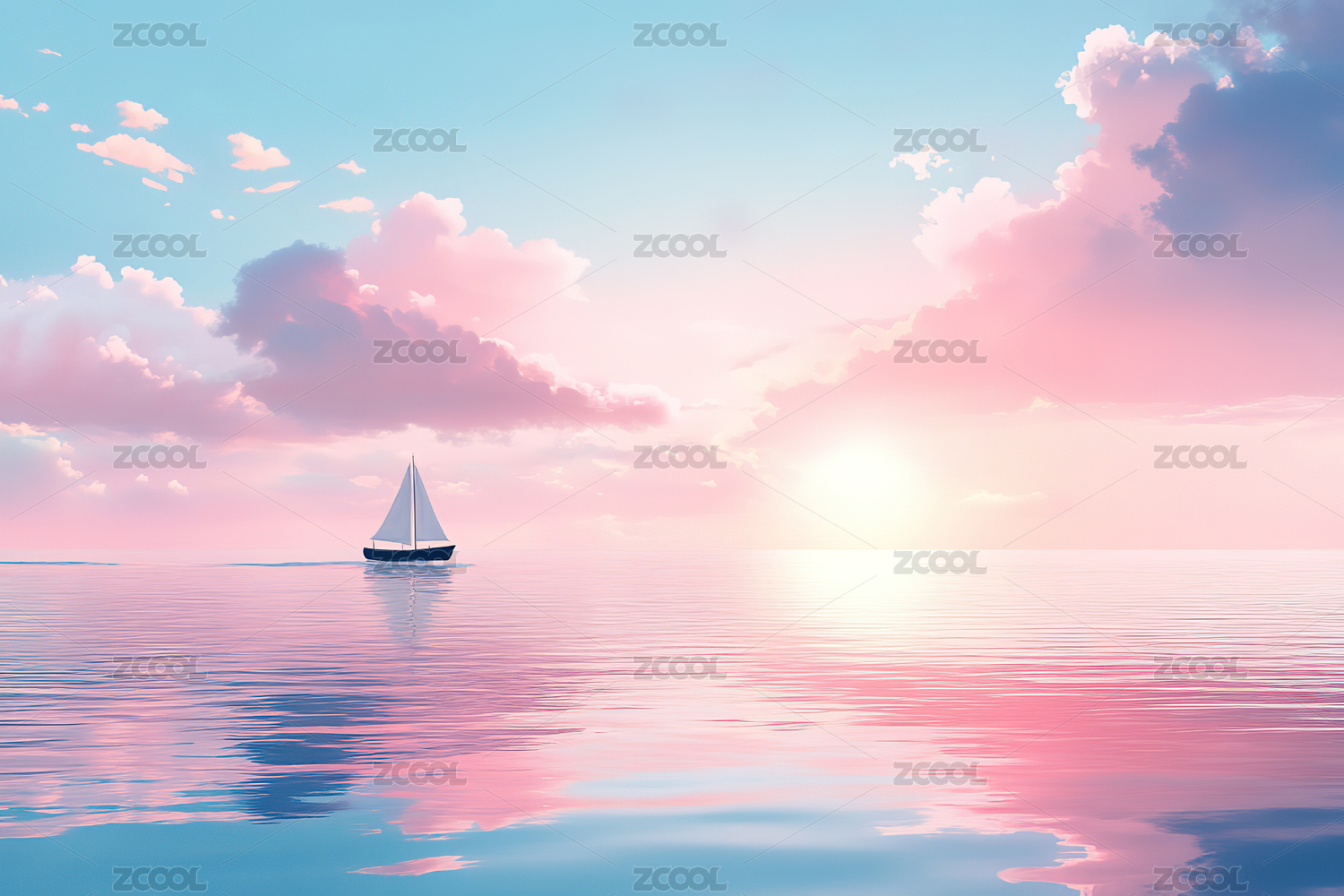动漫风海洋中唯美夕阳下的云彩和帆船