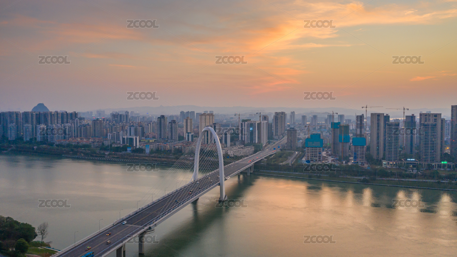 南宁仙葫铁路桥与邕江岸城市风光航拍