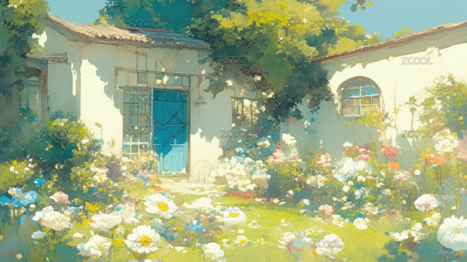 庭院花海与白色小屋