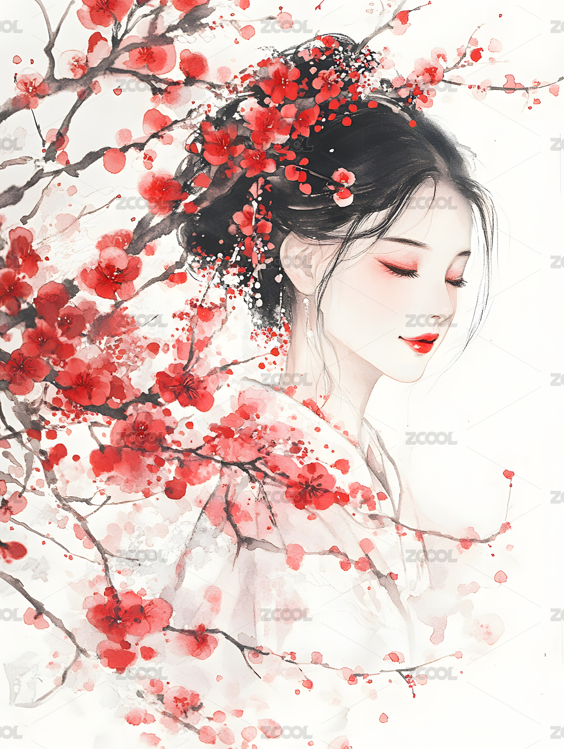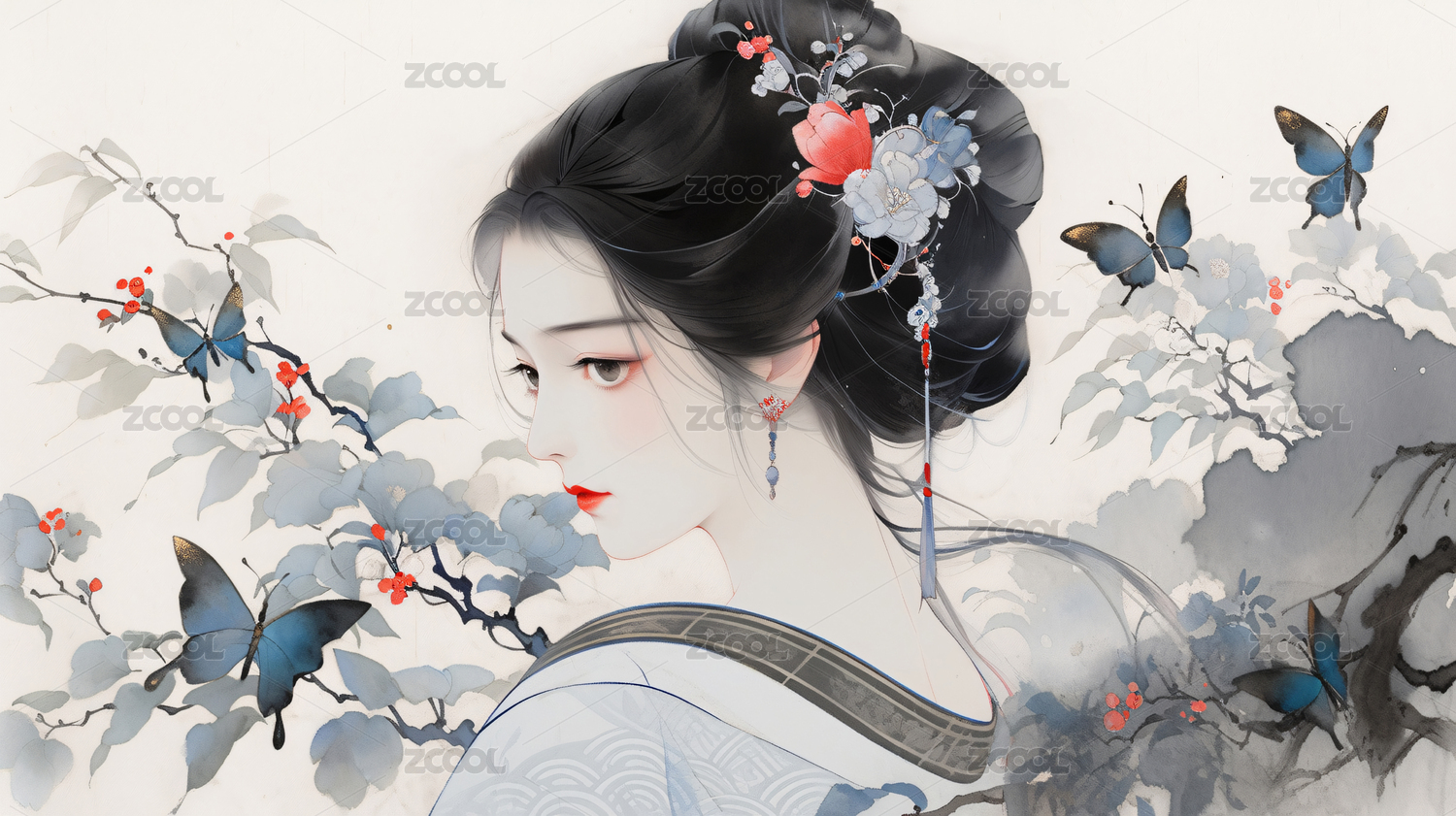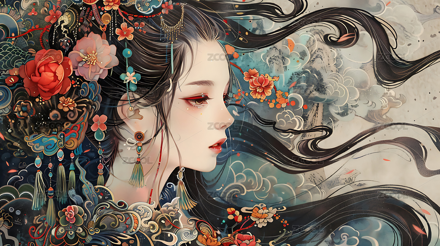 古风女子,花朵装饰,传统服饰,水墨风格,飘逸