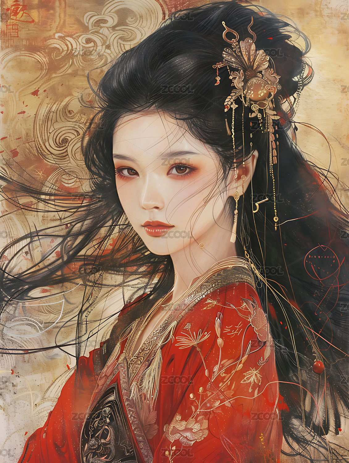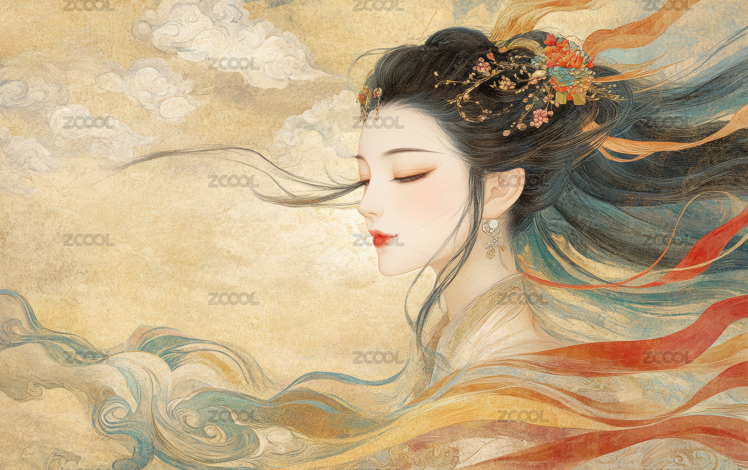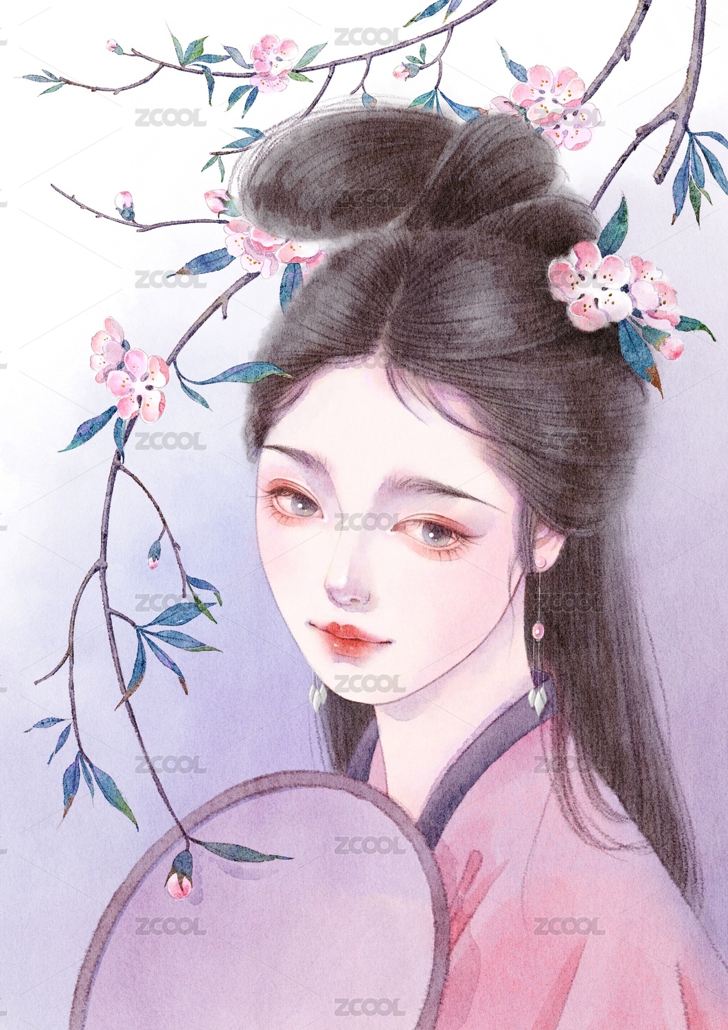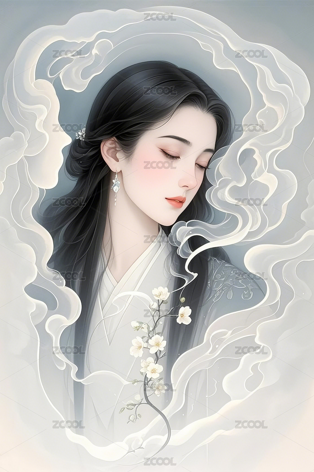 古风女子,花朵装饰,传统服饰,水墨风格,飘逸